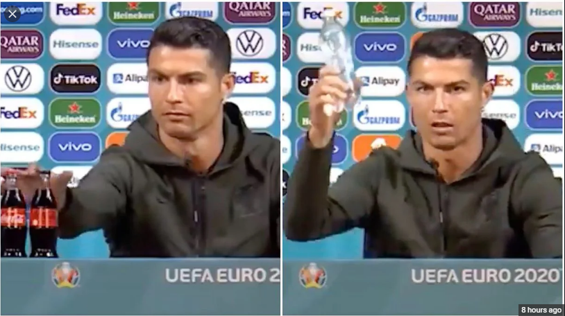 .യൂറോ 2020 ലെ പോര്ച്ചുഗലിന്റെ കന്നി മത്സരത്തിന് മുന്നോടിയായി പരിശീലകൻ ഫെർണാണ്ടോ സാന്റോസിനൊപ്പം ടീമിന്റെ വാർത്താ സമ്മേളനത്തിന് എത്തിയതായിരുന്നു ക്രിസ്റ്റ്യാനോ. സംസാരം തുടങ്ങുന്നതിന് മുന്നായി തനിക്ക് മുമ്പിൽ വെച്ചിരുന്ന കോള എടുത്ത് മാറ്റിയ താരം, കുടിവെള്ളം ഉയര്ത്തി കാട്ടി എല്ലാവരോടും വെള്ളം കുടിക്കാൻ ആവശ്യപ്പെടുകയായിരുന്നു. മുൻപും നിലപാടുകളുടെ പേരിൽ ശ്രദ്ധേയനായിരുന്നു യുവന്റസിന്റെ പോർച്ചുഗൽ താരം.
