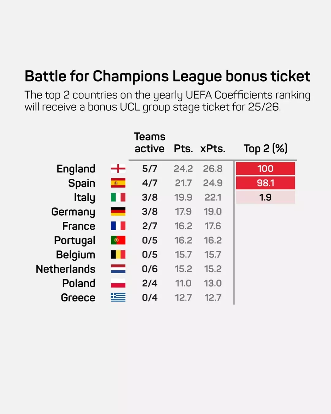 ആഴ്സണൽ, ആസ്റ്റൺ വില്ല,മാഞ്ചസ്റ്റർ യുണൈറ്റഡ്,ടോട്ടൻഹാം, ചെൽസി ടീമുകൾ ഇതിനോടകം യൂറോപ്പിലെ പ്രധാന ലീഗുകളിൽ ക്വാർട്ടർ ബെർത്ത് ഉറപ്പിച്ച് കഴിഞ്ഞു. ഇതോടെ കോ എഫിഷ്യന്റ് റാങ്കിങ്ങില് ഇറ്റലിയെ പിന്തള്ളി ഇംഗ്ലണ്ട് ഒന്നാമതെത്തി. ഇതിന്റെ അടിസ്ഥാനത്തിൽ അഞ്ച് മുതൽ ആറ് വരെ ഇംഗ്ലീഷ് ടീമുകൾക്ക് അടുത്ത വർഷം ചാമ്പ്യൻസ് ലീഗിൽ പന്ത് തട്ടാനാവും എന്നാണ് വിലയിരുത്തപ്പെടുന്നത്.