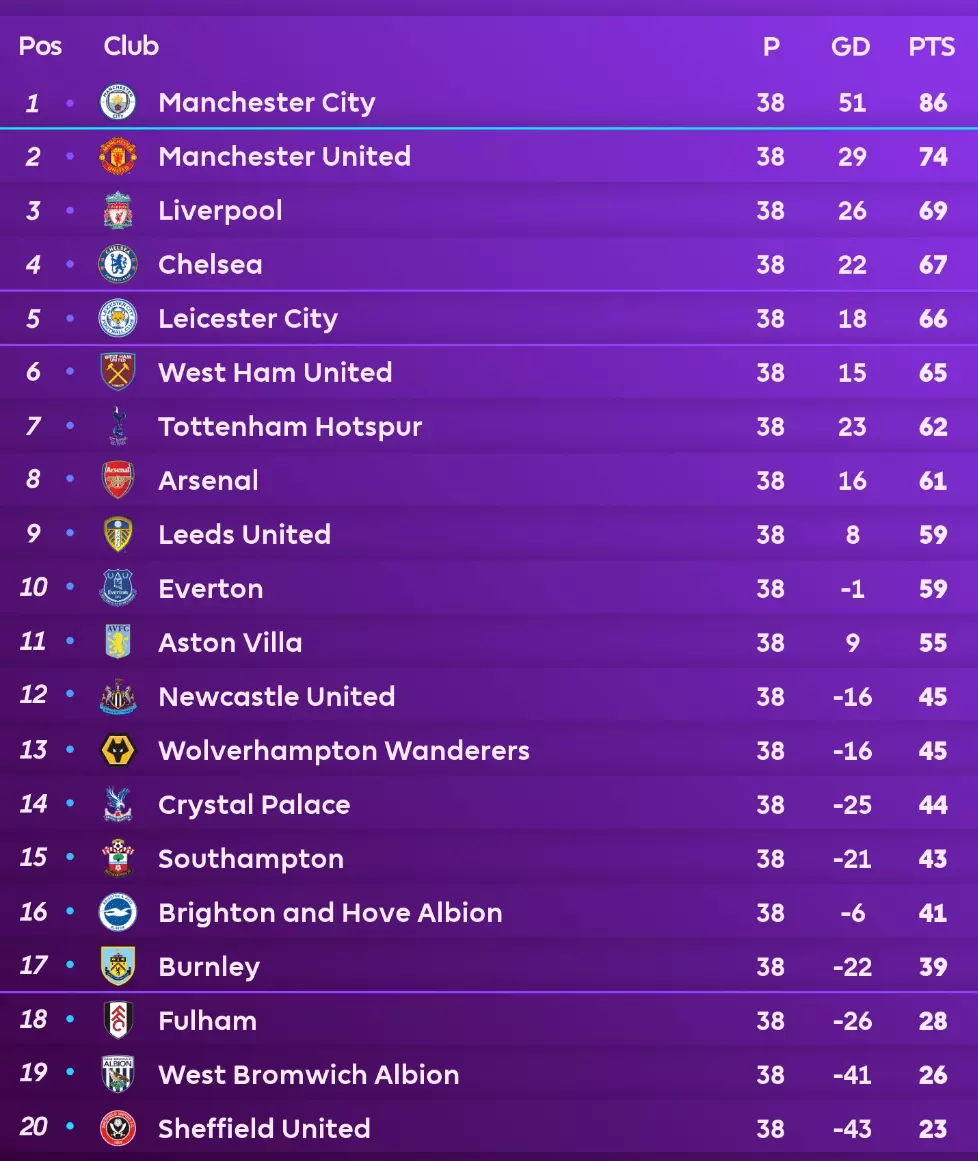 നേരത്തെ തന്നെ ലീഗ് കിരീടം ഉറപ്പിച്ച സിറ്റി വ്യക്തമായ ആധിപത്യം പുലർത്തിയാണ് ഫൈനൽ ഡേയിൽ സ്വന്തം ഗ്രൗണ്ടിൽ വെന്നിക്കൊടി നാട്ടിയത്. ക്രിസ്റ്റൽ പാലസിനെതിരെ രണ്ടു ഗോളിന്റെ നിർണായക വിജയവുമായി ലിവർപൂൾ ടേബിളിൽ മൂന്നാം സ്ഥാനം നേടി ചാമ്പ്യൻസ് ലീഗ് യോഗ്യത സ്വന്തമാക്കി.