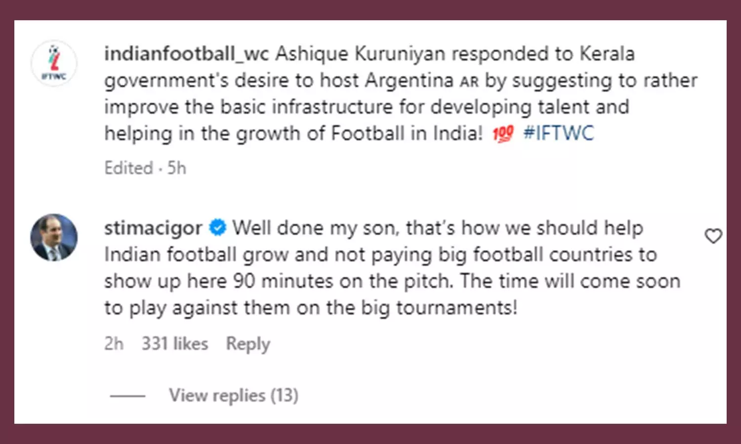 Summary: 'Well done my son, that’s how we should help Indian football grow and not paying big football countries to show up here 90 minutes on the pitch''; Head coach of the Indian national football team Igor Stimac supports Ashique Kuruniyan in 'Argentina in Kerala' debate