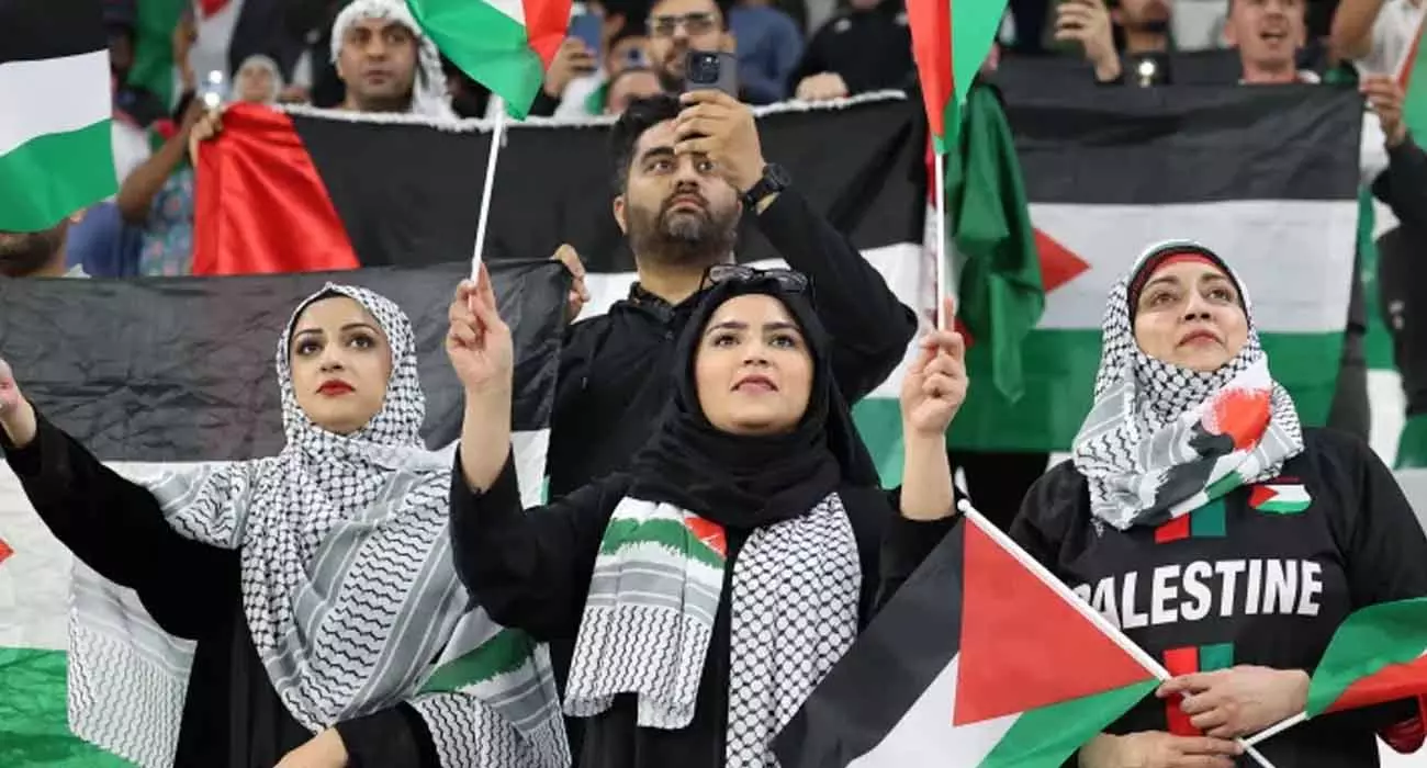 |ഫലസ്തീൻ ദേശീയ പതാകയേന്തിയും ഷാൾ അണിഞ്ഞും പതിനായിരങ്ങളാണ് എഡ്യുക്കേഷൻ സിറ്റി സ്റ്റേഡിയത്തിൽ മത്സരം വീക്ഷിക്കാനെത്തിയത്.
