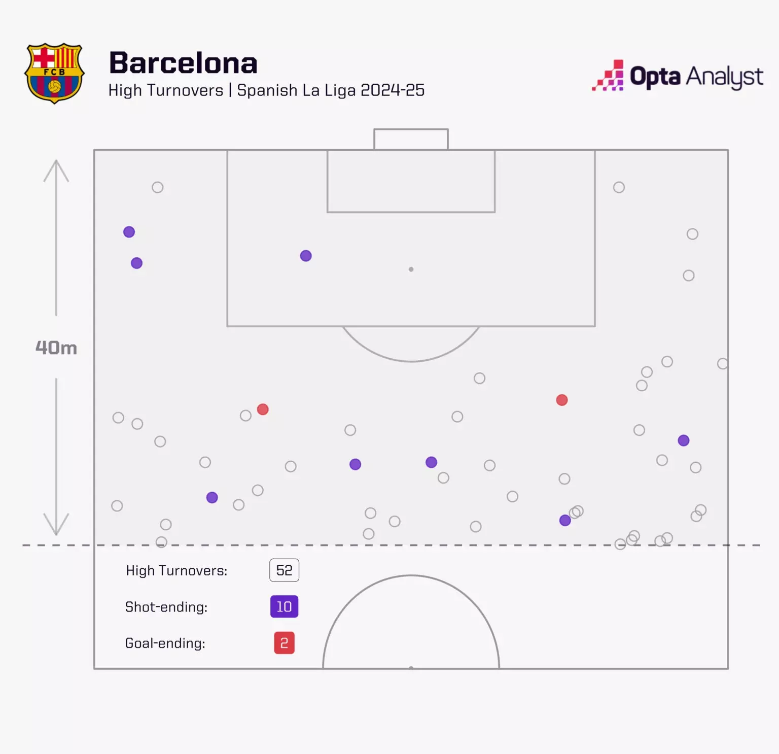 എതിരാളികളുടെ മേൽ സമ്മർദ്ദം തീർക്കുക എന്ന തന്ത്രമാണ് ബാഴ്സ ഏറ്റവും വിജയകരമാക്കി നടപ്പാക്കി വരുന്നത്. എതിരാളികളുടെ ഗോൾപോസ്റ്റിനടുത്തുനിന്നും പന്ത് പിടിച്ചെടുക്കുക എന്ന കോച്ചിന്റെ ആവശ്യം താരങ്ങൾ നടപ്പാക്കുന്നുണ്ട്. മുന്നേറ്റ താരങ്ങളായ റാഫീന്യയും ലാമീൻ യമാലുമാണ് ഇതിന് ചുക്കാൻ പിടിക്കുന്നത്.