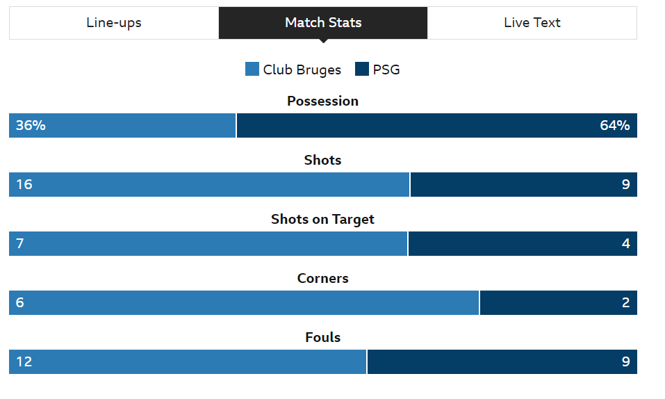 കളി സമനിലയിലായെങ്കിലും താരസമ്പന്നമായ പിഎസ്ജിക്കെതിരെ 16 ഗോൾ ഷോട്ടുകളാണ് ക്ലബ് ബ്രുഗ ഉതിർത്തത്. അതിൽ ഏഴെണ്ണവും ടാർഗറ്റിലേക്കായിരുന്നു. എന്നാൽ മെസ്സിക്കും എംബാപ്പെയ്ക്കും നെയ്മറിനും പായിക്കാനായത് വെറും ഒമ്പത് ഷോട്ട്. ടാർഗറ്റിലേക്ക് നാലെണ്ണം മാത്രവും. എതിരാളികളേക്കാൾ മൂന്നു ഷോട്ട് കുറവ്. എന്നാൽ കളിയിലെ 64 ശതമാനം സമയവും പന്ത് പിഎസ്ജിയുടെ കാലിലായിരുന്നു. ക്ലബ് ബ്രുഗയുടെ പൊസഷൻ 36 ശതമാനം. ബ്രുഗ ആറു കോർണർ സ്വന്തമാക്കിയപ്പോൾ പിഎസ്ജിക്ക് കിട്ടിയത് രണ്ടെണ്ണം.