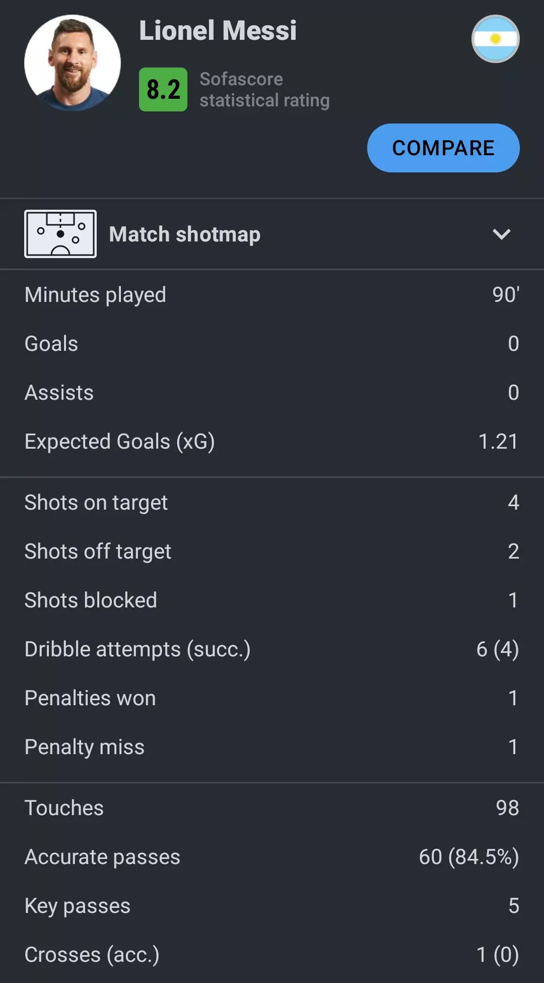 ഗോൾ നേടിയില്ലെങ്കിലും അർജന്റൈൻ നീക്കങ്ങളുടെയെല്ലാം ചരട് മെസ്സിയുടെ കൈയിലായിരുന്നുവെന്ന് കണക്കുകൾ പറയുന്നു. പോളിഷ് പ്രതിരോധം കെട്ടിപ്പൂട്ടിയിട്ടും മത്സരത്തിൽ 98 ടച്ചാണ് മെസ്സി എടുത്തത്. ഒരു വലിയ അവസരം സൃഷ്ടിച്ചെടുക്കുകയും ചെയ്തു. കീ പാസുകളുടെ എണ്ണം അഞ്ച്. നാലു തവണ വിജയകരമായി ഡ്രിബിൾ നടത്തി. താരം ഗോളിലേക്ക് ആകെ ഉതിർത്തത് ഏഴു ഷോട്ട്. ഇതിൽ നാലെണ്ണം ഓൺ ടാർഗറ്റായിരുന്നു.