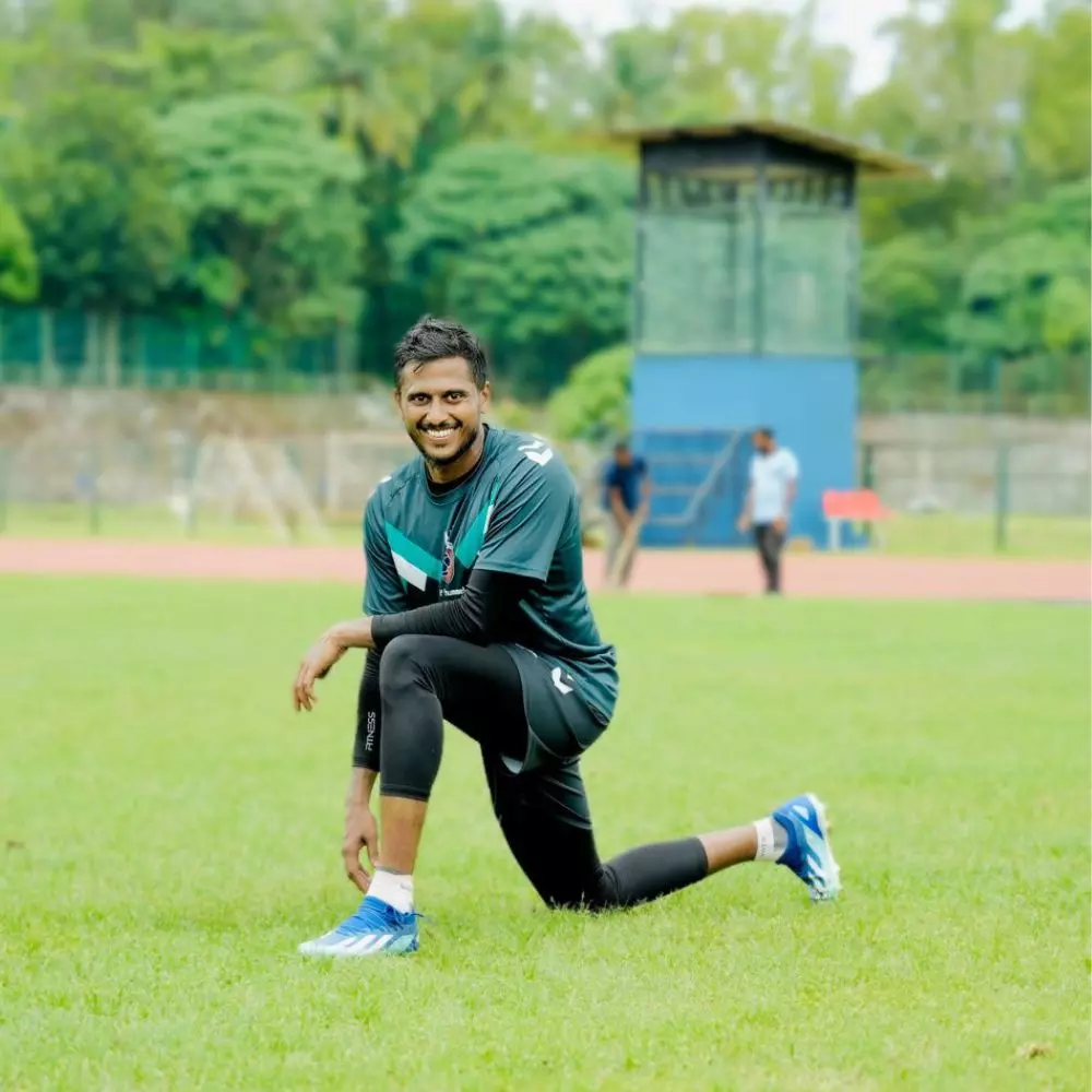 കണ്ണൂർക്കാരൻ മിഥുന് മഞ്ചേരി എന്നത് ഭാഗ്യമൈതാനമാണ്. ടച്ച് ലൈനിൽ വരെ കാണികളെ നിർത്തി 2022 ൽ കേരളം അവസാനമായി സന്തോഷ് ട്രോഫി ജയിക്കുന്നത് ഇവിടെ വെച്ചാണ്. ബംഗാളിൻ്റെ വമ്പ് ഷൂട്ടൗട്ടിൽ മറികടന്ന് കേരളം കിരീടം നേടുമ്പോൾ പോസ്റ്റിന് കാവൽ നിന്നത് ഈ കണ്ണൂർക്കാരൻ. 2018 ൽ കൊൽക്കത്ത സാൾട്ട്ലേക്ക് സ്റ്റേഡിയത്തിൽ വെച്ച് ബംഗാളിനെ തോൽപ്പിച്ച് കേരളം ദേശീയ ചാമ്പ്യന്മാർ ആവുമ്പോഴും മിഥുൻ തന്നെ ഹീറോ. അന്ന് ഷൂട്ടൗട്ടിൽ രണ്ട് ബംഗാളി കിക്കുകൾ സേവ് ചെയ്താണ് മിഥുൻ പതിറ്റാണ്ടുകൾക്കു ശേഷം കേരളത്തിലേക്ക് സന്തോഷ് ട്രോഫി കിരീടമെത്തിച്ചത്. എട്ട് തവണ കേരളത്തെ സന്തോഷ് ട്രോഫിയിൽ പ്രതിനിധീകരിച്ച മിഥുൻ സ്റ്റേറ്റ് ബാങ്ക് ഓഫ് ഇന്ത്യ ഉദ്യോഗസ്ഥനാണ്.