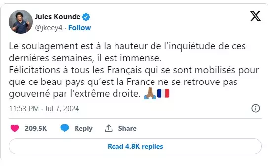 തെരഞ്ഞെടുപ്പ് ഫലം പുറത്തുവന്നതിന് പിന്നാലെ ഫ്രഞ്ച് താരങ്ങൾ സന്തോഷം പങ്കുവെച്ചതാണ് പുതിയ വാർത്ത. സ്പെയിനിനെതിരായ നിർണായക സെമി ഫൈനൽ മത്സരത്തിന് മുന്നോടിയായി വാർത്ത സമ്മേളനത്തിനെത്തിയ ഫ്രഞ്ച് ക്യാപ്റ്റൻ അഡ്രിയാൻ റാബിയോ അത് തുറന്ന് സമ്മതിക്കുകയും ചെയ്തു. തെരഞ്ഞെടുപ്പ് വാർത്തകൾ ഞങ്ങൾ ഒരുമിച്ചല്ല കണ്ടത്. പക്ഷേ തെരഞ്ഞെടുപ്പിനെക്കുറിച്ച് ഞങ്ങൾ ബോധവാൻമാരാണ്. ഒരു ടീമെന്ന നിലയിലല്ല ഈ വിഷയത്തിൽ ഞങ്ങൾ അഭിപ്രായ പ്രകടനം നടത്തിയത്. പക്ഷേ തെരഞ്ഞെടുപ്പ് ഫലത്തിൽ ആശ്വാസം കൊള്ളുന്ന നിരവധി താരങ്ങൾ ഞങ്ങൾക്കൊപ്പമുണ്ട്. അഡ്രിയാൻ റാബിയോ മാധ്യമങ്ങളോട് പറഞ്ഞു.