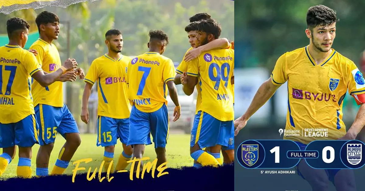റിലയൻസ് ഫൗണ്ടേഷൻ ഡവലപ്മെൻറ് ലീഗിൽ എതിരില്ലാത്ത ഒരു ഗോളിന് മുംബൈ സിറ്റി എഫ്സിയെ വീഴ്ത്തി കേരളാ ബ്ലാസ്റ്റേഴ്സ്. അഞ്ചാം മിനുട്ടിൽ ക്യാപ്റ്റൻ ആയുഷ് അധികാരി നേടിയ ഗോളിലാണ് കൊമ്പന്മാരുടെ വിജയം. നഗോവയിൽ നടന്ന മത്സരത്തിൽ ലോങ് റേഞ്ചറിലൂടെയാണ് താരം ഗോൾ കണ്ടെത്തിയത്.