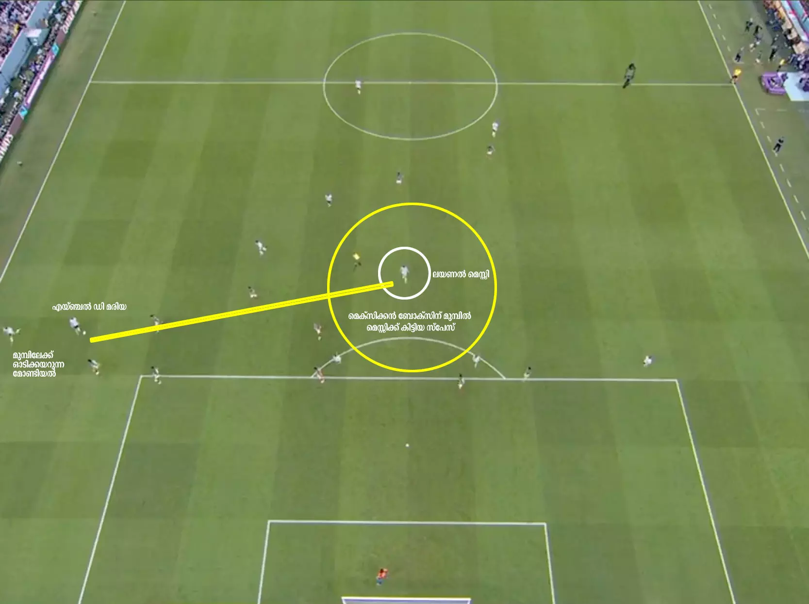 |പന്തു ലഭിച്ച ശേഷം നാലു ചുവടു മാത്രം മുന്നോട്ടായാനുള്ള സ്പേസാണ് മെസ്സിക്കു കിട്ടിയത്. ഗോൾകീപ്പറുടെ വിഷനും പ്രതിരോധത്തിന്റെ പകപ്പും മനസ്സിലാക്കിയെടുക്കാന് ആ സമയം ധാരാളമായിരുന്നു