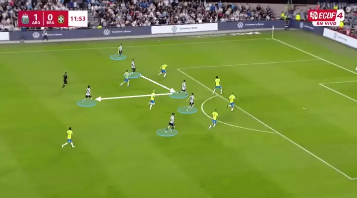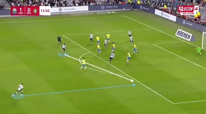 ഈ ചിത്രമൊന്ന് നോക്കൂ. ഇതിൽ വലതു ഭാഗത്ത് ഒരു അർജന്റീന താരവുമില്ല. അതുകൊണ്ടുതന്നെ ബ്രസീൽ പ്രതിരോധനിരയുടെ ശ്രദ്ധയെല്ലാം ഇടതുവശത്താണ്. ഇത് അർജന്റീന ബ്രസീലിനായി ഒരുക്കിയ ഒരു ട്രാപ്പായിരുന്നുവെന്നതിന് തുടർന്നുള്ള നിമിഷങ്ങൾ സാക്ഷി. ശൂന്യമായിക്കിടക്കുന്ന വലതുവശത്തെ സ്പെയിസിലേക്ക് മൊളിന ഓടിക്കയറുന്നു.