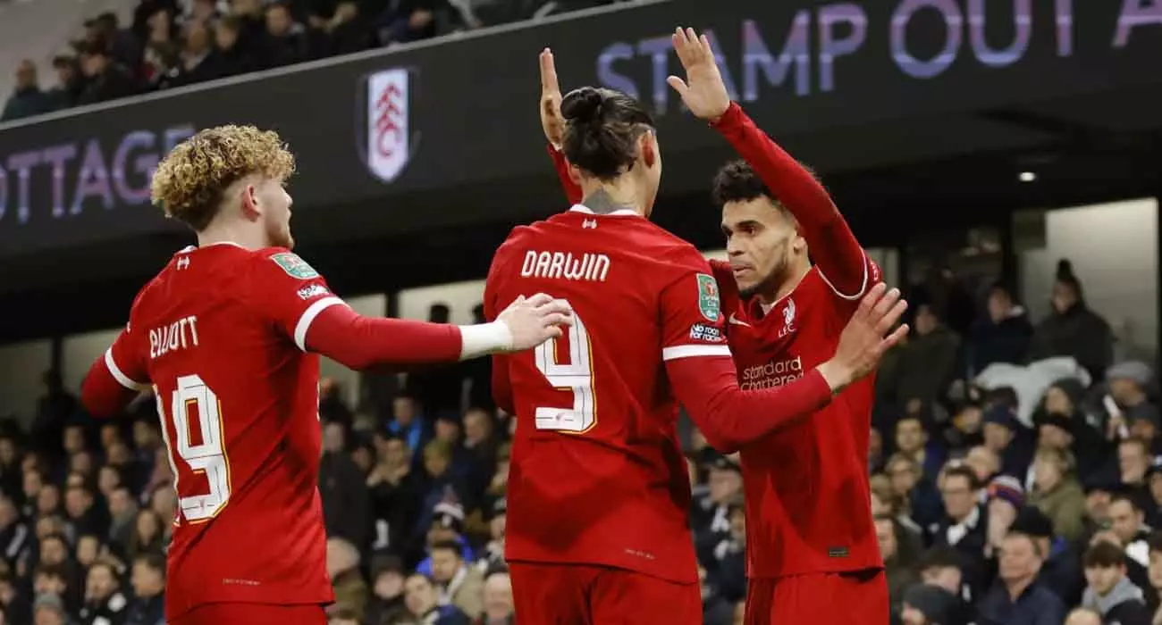 ലണ്ടൻ: കരബാവോ കപ്പിൽ വീണ്ടുമൊരു ലിവർപൂൾ-ചെൽസി ഫൈനൽ. രണ്ടാം പാദ സെമിയിൽ ഫുൾഹാമിനോട് സമനില വഴങ്ങിയെങ്കിലും(1-1) ആദ്യ പാദ വിജയത്തിന്റെ ബലത്തിൽ ചെമ്പട കലാശകളിക്ക് യോഗ്യത നേടുകയായിരുന്നു (3-2).11ാം മിനിറ്റിൽ ലൂയിസ് ഡയസിലൂടെ ലിവർപൂളാണ് മുന്നിലെത്തിയത്. 76ാം മിനിറ്റിൽ ഇസ ഡിയോപിലൂടെ ഫുൾഹാം സമനിലപിടിച്ചു.