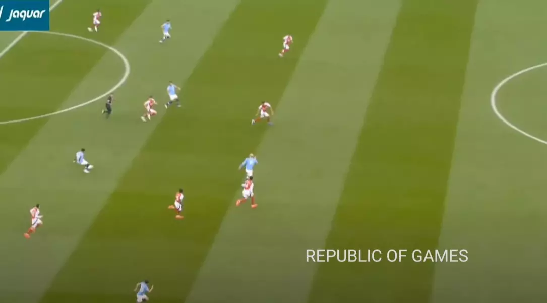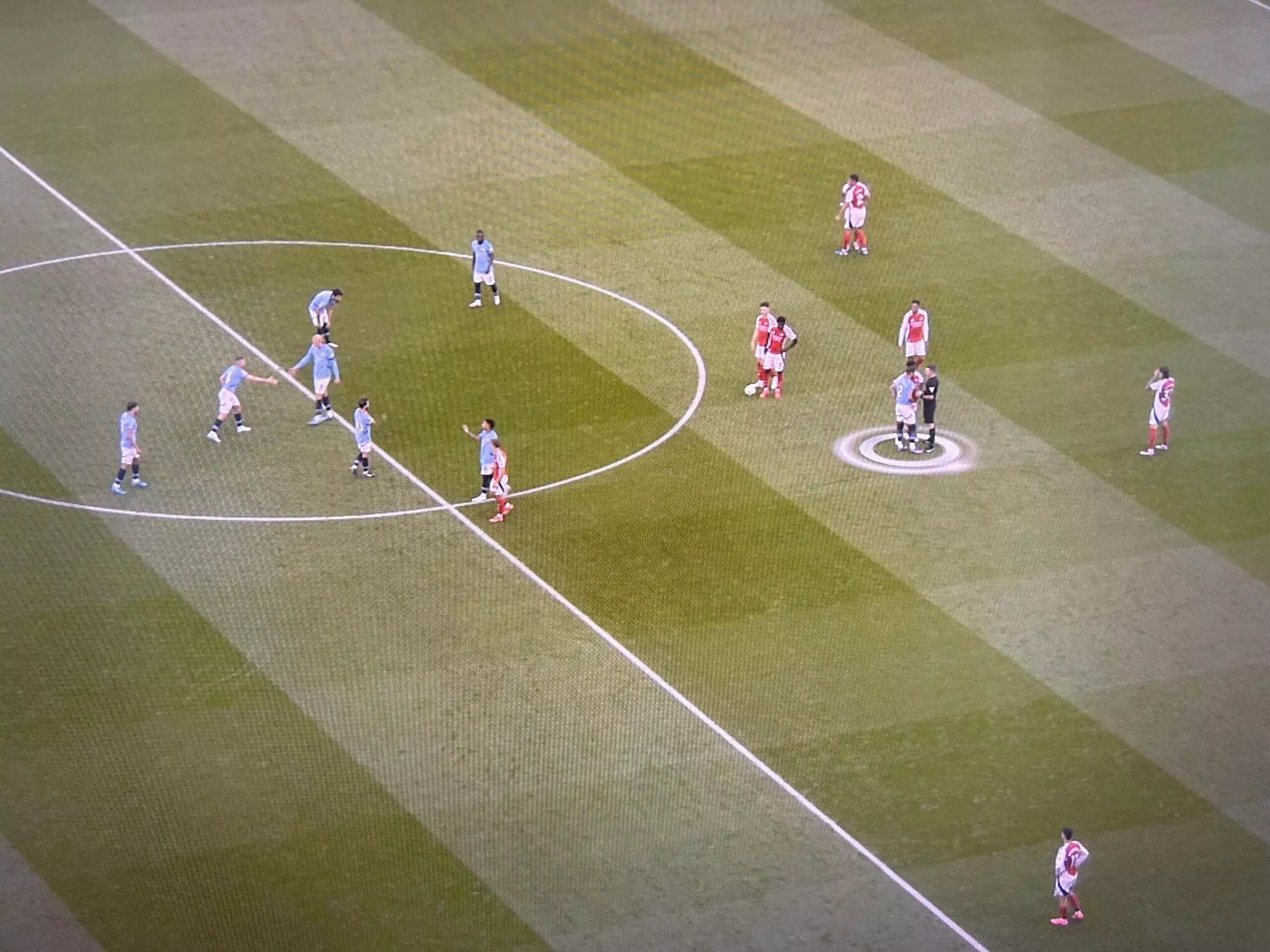 22ാം മിനുറ്റ് നാടകീയ രംഗങ്ങൾക്കാണ് സാക്ഷിയായത്. ഇൽകയ് ഗുണ്ടോഗൻ തോമസ് പാർട്ടിയെ ഫൗൾചെയ്യുന്നു. സിറ്റി ക്യാപ്റ്റനായ കൈൽവാക്കറെയും ഗണ്ണേഴ്സ് ക്യാപ്റ്റനായ ബുക്കായോ സാക്കയെും റഫറി മൈക്കൽ ഒലിവർ അടുത്തേക്ക് വിളിച്ചു. അതിനിടയിൽ അപ്പുറത്ത് ആർസനൽ താരങ്ങളായ ഡെക്ലൻ റൈസും തോമസ് പാർട്ടിയും ഫ്രീകിക്കിന് തയ്യാറെടുക്കുകയായിരുന്നു.