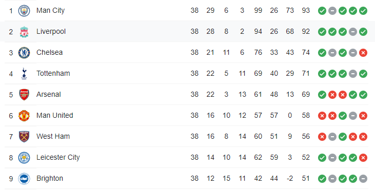 വാറ്റ്ഫോഡിനെ 2-1 പരാജയപ്പെടുത്തി ചെൽസി 74 പോയിന്റുകളോടെ മൂന്നാം സ്ഥാനത്തും, നോർവിച്ച് സിറ്റിയെ അഞ്ച് ഗോളുകൾക്ക് പരാജയപ്പെടുത്തി ടോട്ടൻഹാം ഹോട്സ്പർ 71 പോയിന്റുകളോടെ നാലാം സ്ഥാനത്തും ലീഗ് സീസൺ ഫിനിഷ് ചെയ്തു. ആദ്യ നാല് സ്ഥാനങ്ങളിലുള്ള മാഞ്ചസ്റ്റർ സിറ്റി, ലിവർപൂൾ, ചെൽസി, ടോട്ടൻഹാം ഹോട്സ്പർ എന്നിവരാണ് അടുത്ത സീസണിലെ ചാമ്പ്യൻസ് ലീഗിന് യോഗ്യത നേടിയിട്ടുള്ളത്.