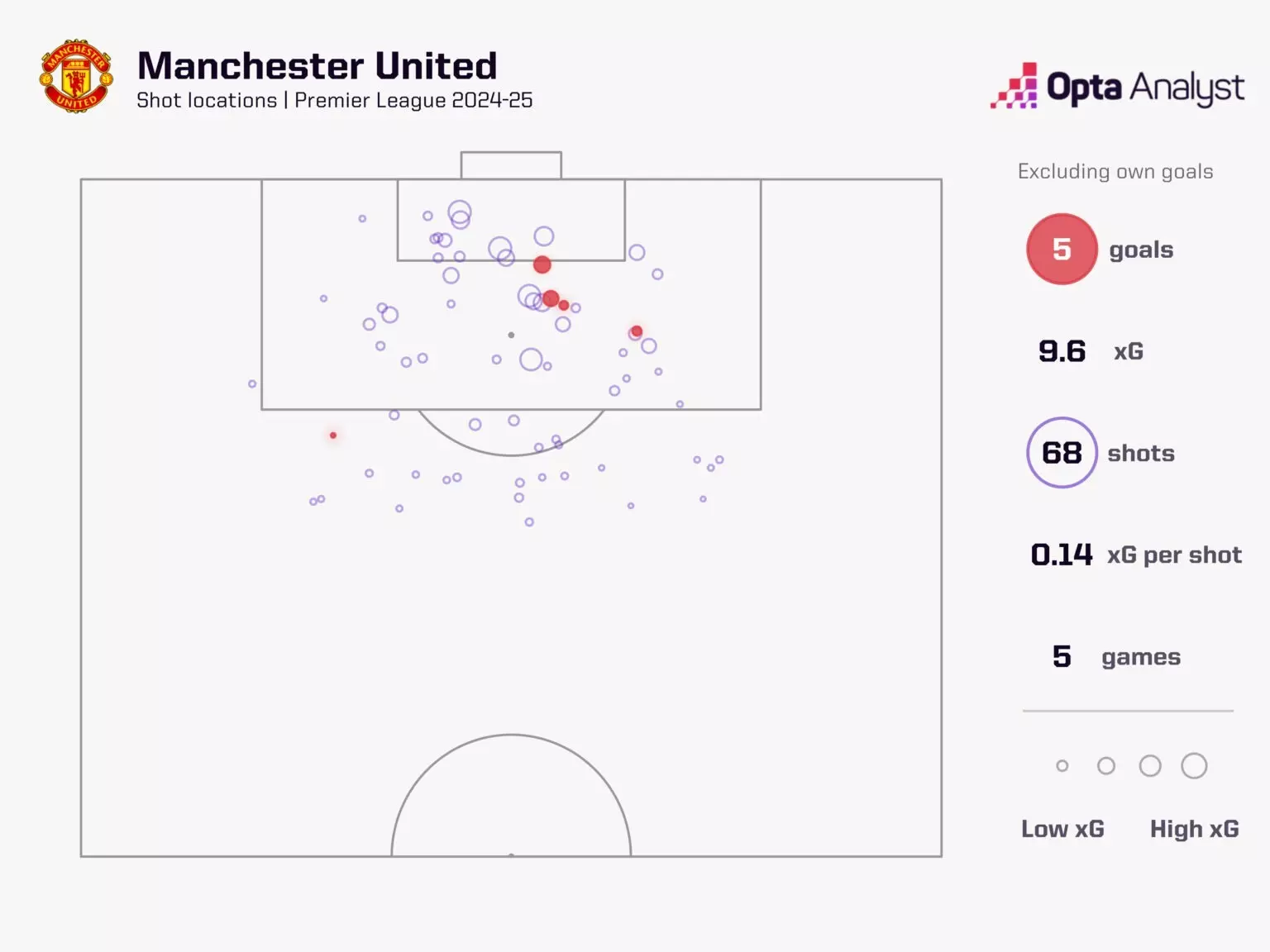 യുനൈറ്റഡ് 68 ഷോട്ടുകൾ എതിർടീം ഗോൾമുഖത്തേക്ക് പായിച്ചിട്ടുണ്ട്. പക്ഷേ പിറന്നത് അഞ്ചുഗോൾ മാത്രം.ഇതിൽ കാണുന്ന വട്ടങ്ങളുടെ വലുപ്പം ഗോൾസാധ്യതക്കനുസരിച്ചാണ് നിർണയിച്ചിരിക്കുന്നത്. അഥവാ വട്ടത്തിന്റെ വലുപ്പം കൂടുന്നതിന് അനുസരിച്ച് ഗോൾ സാധ്യതയും കൂടി വരുന്നു. യുനൈറ്റഡിന് സീസണിൽ ഇതുവരെയും ഒരു പെനൽറ്റി പോലും കിട്ടിയിട്ടില്ല. എന്നിട്ടും അവർക്ക് 9.59 എന്ന മികച്ച എക്സ്പെക്റ്റെഡ് ഗോൾ ശരാശരിയുണ്ട്. ലീഗിൽ മാഞ്ചസ്റ്റർ സിറ്റി, ലിവർപൂൾ എന്നീ വമ്പൻമാർക്ക് മാത്രമാണ് ഇതിനേക്കാൾ മികച്ച ശരാശരിയുള്ളത്. ഇതിൽ നിന്നും നമ്മൾ എന്ത് മനസ്സിലാക്കണം?. യുനൈറ്റഡ് ചാൻസുകൾ ക്രിയേറ്റ് ചെയ്യുന്നു. പക്ഷേ അത് ഫലപ്രദമായി വിനിയോഗിക്കുന്നതിൽ പരാജയമാകുന്നു.