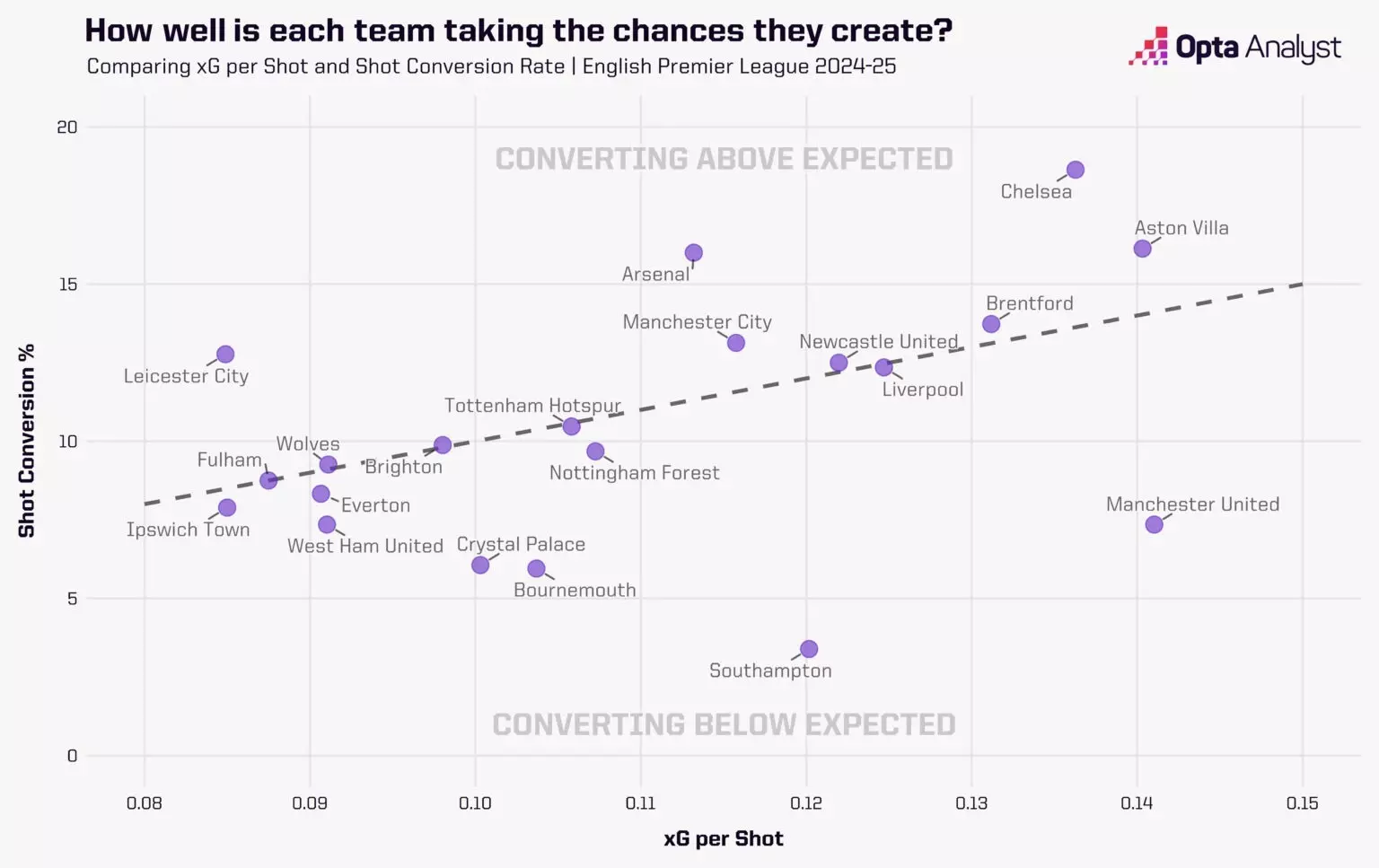 ഒരു ടീം തൊടുത്ത ഷോട്ടുകൾ അടിസ്ഥാനമാക്കിയാണ് XG അഥവാ എക്സ്പെക്റ്റഡ് ഗോളുകൾ കണക്കാക്കുന്നത്. ഓരോ ഷോട്ടിനും ഒരു XG മൂല്യമുണ്ട്. ഷോട്ട് ഗോളാകാനുള്ള സാധ്യതയനുസരിച്ചാണ് ഇതു നിർണയിച്ചിരിക്കുന്നത്. ഗോളിലേക്കുള്ള ദൂരം, ഗോളടിക്കുന്ന ആംഗിൾ, എതിർ ടീമിലെ കളിക്കാരുടെ സാന്നിധ്യം, അസിസ്റ്റിന്റെ സ്വഭാവം, സെറ്റ് പീസുകൾ എന്നിവയെല്ലാം പരിഗണിക്കും. പ്രീമിയർലീഗ് ടീമുകളുടെ എക്സ്പെക്റ്റഡ് ഗോൾസ് കൺവേർഷൻ ഗ്രാഫാണിത്. യുനൈറ്റഡ് എവിടെ നിൽക്കുന്നെന്ന് ഈ ഗ്രാഫ് നമുക്ക് പറഞ്ഞുതരുന്നുണ്ട്.