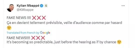 വാർത്തകൾക്ക് പിന്നാലെ തനിക്കെതിരെ പ്രചരിക്കുന്നത് വ്യാജവാർത്തയാണെന്ന് എംബാപ്പെ എക്സിൽ പോസ്റ്റ് ചെയ്തു. ‘‘ഇത് വ്യാജവാർത്തയാണ്. ഹിയറിങ് നടക്കുന്ന സായാഹ്നത്തിൽ തന്നെ ഈ വാർത്ത വരുന്നത് പ്രതീക്ഷിച്ചതായിരുന്നു’’ -എന്നാണ് എംബാപ്പെ പോസ്റ്റ് ചെയ്തത്.