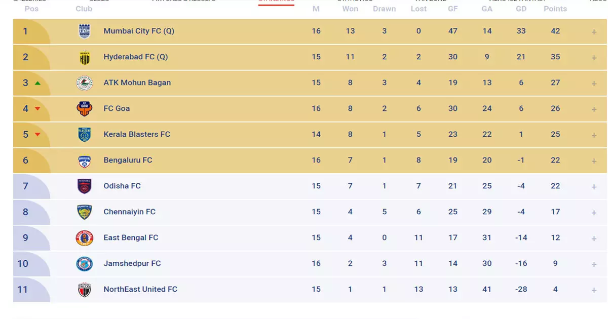 12 പോയിൻറുള്ള ഈസ്റ്റ് ബംഗാൾ ഒമ്പതാം സ്ഥാനത്തും 2021-22 സീസൺ ടേബിൾ ടോപ്പർമാരായ ജംഷഡ്പൂർ എഫ്.സി ഒമ്പത് പോയിൻറുമായി 10ാം സ്ഥാനത്തുമാണുള്ളത്. ഇന്ന് കേരളാ ബ്ലാസ്റ്റേഴ്സിനെ നേരിടുന്ന നോർത്ത് ഈസ്റ്റ് യുണൈറ്റഡാണ് അവസാന സ്ഥാനത്തുള്ളത്. 15 മത്സരങ്ങൾ പൂർത്തിയാക്കിയപ്പോൾ ഒരു കളിയിൽ മാത്രമാണ് ജയിച്ചത്. 13 മത്സരങ്ങളിലും തോറ്റു. നിലവിൽ 25 പോയിന്റുമായി അഞ്ചാം സ്ഥാനത്താണ് ബ്ലാസ്റ്റേഴ്സ്. പതിനാല് മത്സരങ്ങളിൽ നിന്ന് എട്ട് വിജയമാണ് ബ്ലാസ്റ്റേഴ്സിന്റെ അക്കൗണ്ടിലുള്ളത്.