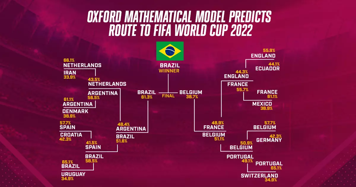 ഇപ്പോളിതാ ഒരു പഠനത്തിന്റെ അടിസ്ഥാനത്തില് ലോകകപ്പ് വിജയികളെ പ്രവചിച്ചിരിക്കുകയാണ് ഓക്സ്ഫോര്ഡ് യൂണിവേഴ്സിറ്റി. ബ്രസീല് ഇക്കുറി ലോകകപ്പില് മുത്തമിടുമെന്നാണ് യൂണിവേഴ്സിറ്റിയുടെ പ്രവചനം. യൂണിവേഴ്സിറ്റിയിലെ ജോഷ്വ ബുള് എന്ന ഗണിത ശാസ്ത്രജ്ഞനാണ് പ്രവചനം നടത്തിയിരിക്കുന്നത്. ഓക്സ്ഫോര്ഡ് യൂണിവേഴ്സിറ്റി മാത്തമാറ്റിക്കല് മോഡല് എന്നാണ് പ്രവചനം അറിയപ്പെടുന്നത്.