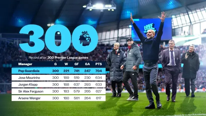 പ്രീമിയർ ലീഗിൽ കോച്ചെന്ന നിലയിലുള്ള 300 മത്സരങ്ങൾ പൂർത്തിയാക്കിയതിന് പിന്നാലെയുള്ള കണക്കുകളാണിത്.