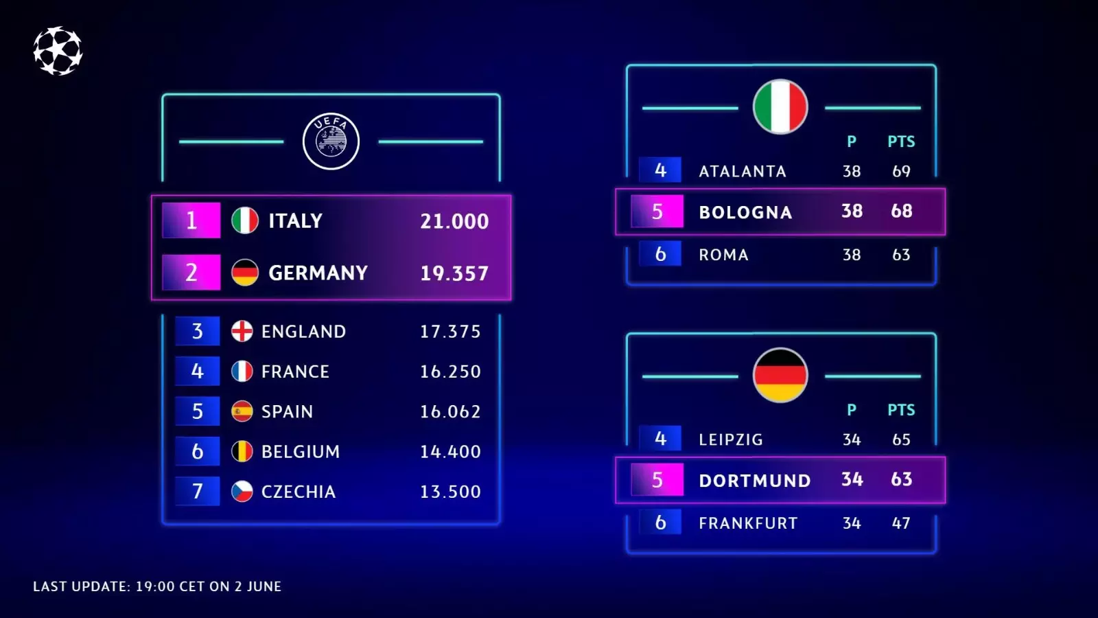 പോയ വർഷം ഈ കോഎഫിഷ്യന്റ് റാങ്കിങ്ങിന്റെ ഗുണം ജർമൻ ബുണ്ടസ് ലീഗിനും ഇറ്റാലിയൻ സെരിഎക്കുമാണ് ലഭിച്ചത്. അങ്ങനെ ഈ ലീഗുകളിലെ അഞ്ചാം സ്ഥാനക്കാരായ ബൊലോനക്കും ഡോർട്ട്മുണ്ടിനും ഇക്കുറി കളിക്കാൻ അവസരം കിട്ടി.