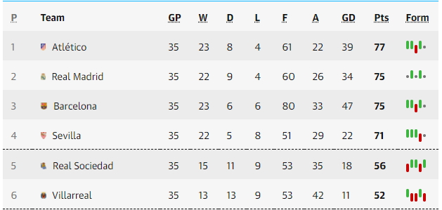 35 കളികളില് 75 പോയിന്റുമായി ലീഗിൽ രണ്ടാമതാണ് റയൽ. 35 കളികളില് 77പോയിന്റുമായി അത്ലറ്റികോ മാഡ്രിഡാണ് പോയിന്റ് പട്ടികയില് ഒന്നാമത്
