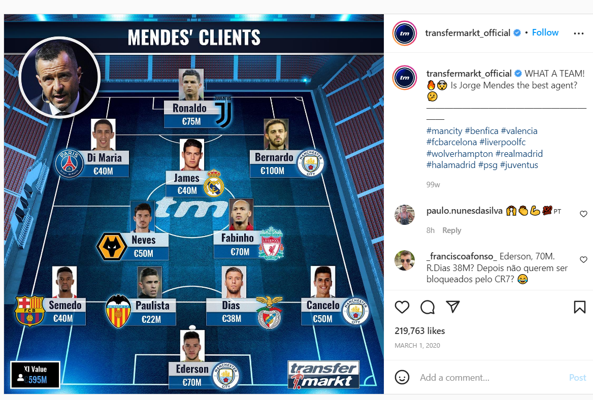 ജോർജ് മെൻഡിസ് ഇലവൻ എന്ന പേരിൽ തങ്ങളുടെ ഔദ്യോഗിക ഇൻസ്റ്റഗ്രാം അക്കൗണ്ടിൽ ട്രാൻസ്ഫർ മാർക്കറ്റ് പങ്കുവച്ച പോസ്റ്ററിൽ വില കുറഞ്ഞതാണ് റോണോയെ ചൊടിപ്പിച്ചത്. ക്രിസ്റ്റ്യാനോക്ക് 75 മില്യൺ യൂറോയാണ് വില നിശ്ചയിച്ചിരുന്നത്. മാഞ്ചസ്റ്റർ സിറ്റിയുടെ പോർച്ചുഗീസ് താരം ബെർണാഡോ സിൽവയായിരുന്നു ഇലവനിലെ മൂല്യം കൂടിയ കളിക്കാരൻ, 100 ദശലക്ഷം യൂറോ. രണ്ടാമതായിരുന്നു ക്രിസ്റ്റ്യാനോ. എയ്ഞ്ചൽ ഡി മരിയ (40 മില്യൺ യൂറോ), ജെയിംസ് റോഡ്രിഗസ് (40 മില്യൺ യൂറോ), റൂബൻ നെവസ് (50 മില്യൺ യൂറോ), ഫാബിഞ്ഞോ (70 മില്യൺ യൂറോ), സെമെഡോ (40 മില്യൺ യൂറോ), പൗളിസ്റ്റോ (22 മില്യൺ യൂറോ), ഡിയാസ് (38 മില്യൺ യൂറോ), കാൻസെലോ (50 മില്യൺ യൂറോ), എഡേഴ്സൺ (70 മില്യൺ യൂറോ) എന്നിങ്ങനെയായിരുന്നു ഇലവനിലെ മറ്റു കളിക്കാരുടെ മൂല്യം. പോർച്ചുഗീസ് ഫുട്ബോൾ ഏജന്റാണ് ജോർജ് മെൻഡോസ്.