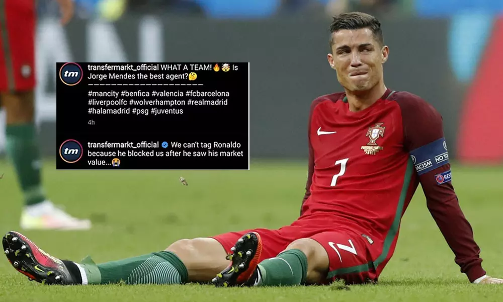 'താങ്കളുടെ പ്രായത്തിലുള്ള ഗ്രൂപ്പിൽ താങ്കൾ നമ്പർ വൺ ആണ്' എന്നാണ് ട്രാൻസ്ഫർ മാർക്കറ്റ് താരത്തെ അറിയിച്ചത്. ഒരു സ്മൈലി അയച്ചാണ് ഇതിനോട് റോണോ പ്രതികരിച്ചത്. പിന്നീട് അക്കൌണ്ട് ബ്ലോക് ചെയ്യുകയും ചെയ്തു.