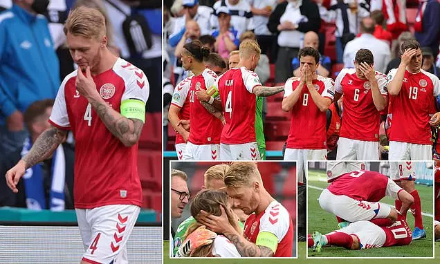 Denmark's captain @simonkjaer1989 ensured Eriksen didn't swallow his tongue when he was unconscious, gave him CPR, told the squad to form a protective shield around him, consoled Eriksen's horrified wife & has now led his team back into the game. You, sir, are a hero. pic.twitter.com/ih3qJm1x7s