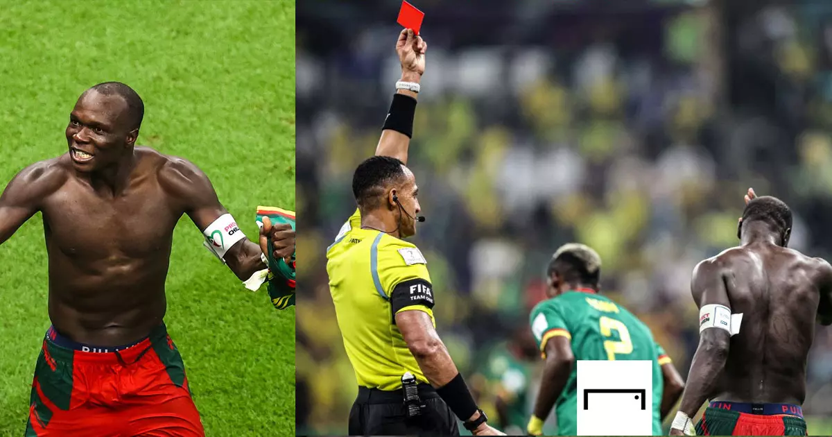 അധിക സമയം വരെ ഗോളടിക്കാൻ കഴിയാതിരിക്കുകയും ബ്രസീലിനെ ഗോളടിക്കാതെ പിടിച്ചുകെട്ടുകയും ചെയ്ത കാമറൂൺ 92ാം മിനുട്ടിൽ വെടിപൊട്ടിച്ചു. വിൻസൻറ് അബൂബകറിന്റെ ഹെഡ്ഡറിലൂടെയാണ് സമനിലയിലേക്ക് നീങ്ങുമെന്ന് മിക്കവരും ഉറപ്പിച്ച മത്സരം കാമറൂൺ നേടിയത്. എന്നാൽ ഗോൾ നേടി 93ാം മിനുട്ടിൽ തന്നെ ചുവപ്പുകാർഡുമായി ഇയാൾ കളത്തിൽനിന്ന് കയറിപ്പോകുകയും ചെയ്തു. ഗോളടിച്ച ആഘോഷത്തിൽ കുപ്പായമൂരിയതിനാണ് റഫറി ഇസ്മായിൽ ഇൽഫത് ഇദ്ദേഹത്തിനെതിരെ ചുവപ്പുകാർഡുയർത്തിയത്. കാർഡ് നൽകും മുമ്പേ കൈകൊടുത്തു അഭിനന്ദിച്ചു റഫറി.