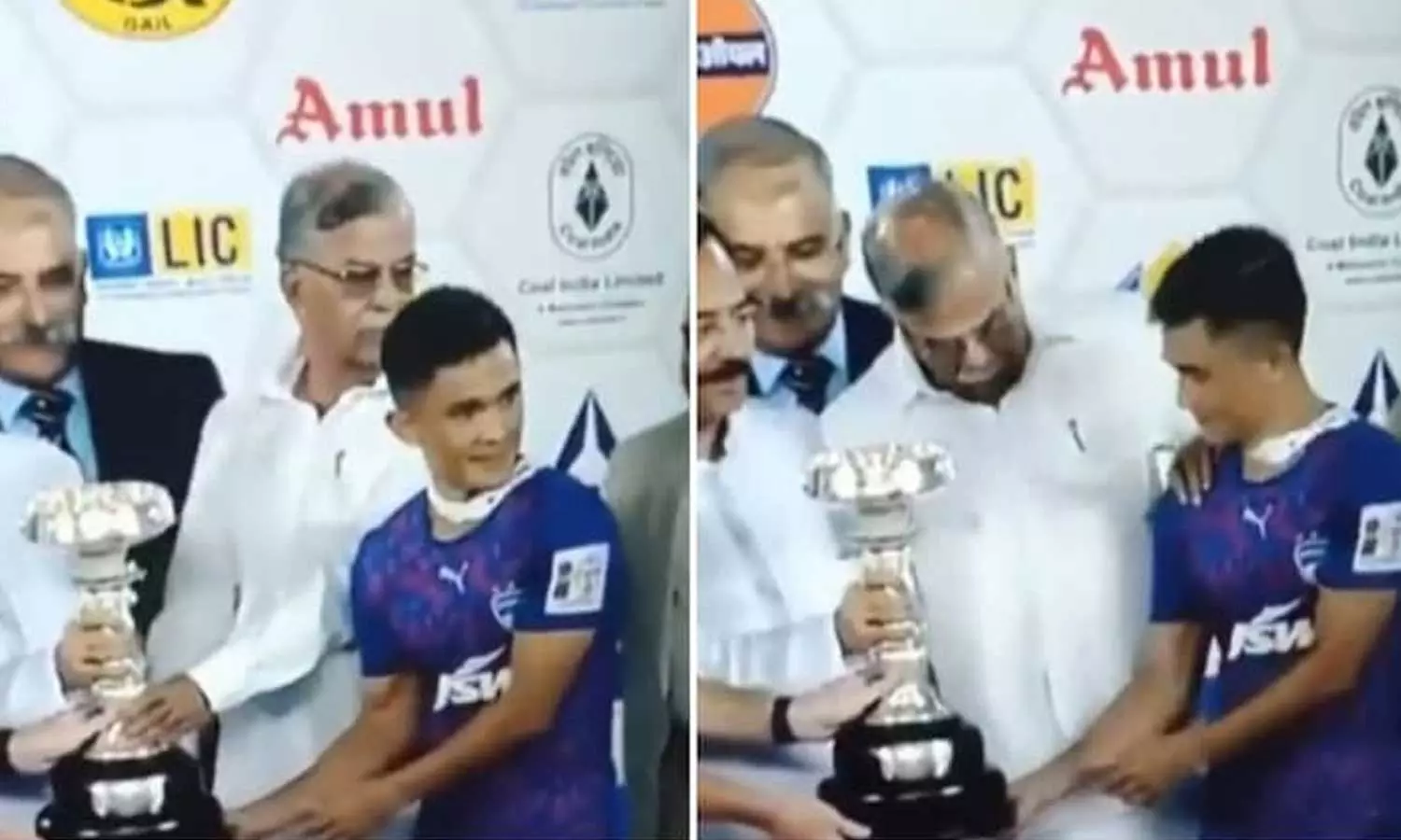 ഇതിന് പിന്നാലെ മത്സരശേഷം നടന്ന സമ്മാനദാന ചടങ്ങിന്റെ വീഡിയോകളാണ് സോഷ്യൽ മീഡിയയിൽ വൈറലാകുന്നത്. കിരീടം സ്വീകരിക്കാനെത്തിയ ബെംഗളൂരു ക്യാപ്റ്റൻ സുനിൽ ഛേത്രിയെ പശ്ചിമ ബംഗാൾ ഗവർണർ ലാ ഗണേഷൻ തള്ളിമാറ്റുന്നതാണ് ഈ വീഡിയോയിലുള്ളത്. ഫോട്ടോയിൽ തന്റെ മുഖവും വരാൻ വേണ്ടിയാണ് ഗവർണർ ക്യാപ്റ്റനോട് നീങ്ങി നിൽക്കാൻ പറയുന്നത്.