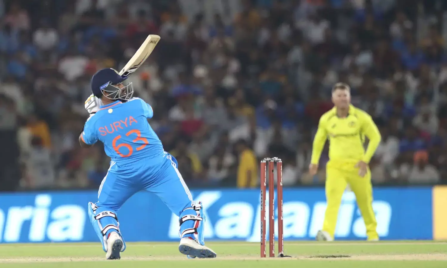എന്നാൽ, രണ്ടാം വിക്കറ്റിൽ സ്റ്റീവ് സ്മിത്തിനെ കൂട്ടുപിടിച്ച് ഡേവിഡ് വാർണർ ഇന്ത്യൻ പേസ് നിരയെ ആക്രമിച്ചുകളിക്കുകയായിരുന്നു പിന്നീട്. അർധസെഞ്ച്വറിയും കടന്ന് മുന്നേറവെ വാർണറെ വീഴ്ത്തി രവീന്ദ്ര ജഡേജയുടെ വക ഇന്ത്യയ്ക്ക് ബ്രേക്ത്രൂ. മിഡ്വിക്കറ്റിനു മുകളിലൂടെ സ്ലോഗ് സ്വീപ്പിനുള്ള ശ്രമം ഗില്ലിന്റെ കൈയിലാണ് അവസാനിച്ചത്. 53 പന്ത് നേരിട്ട് ആറ് ഫോറും രണ്ട് സിക്സും സഹിതം 52 റൺസെടുത്താണ് വാർണർ മടങ്ങിയത്.