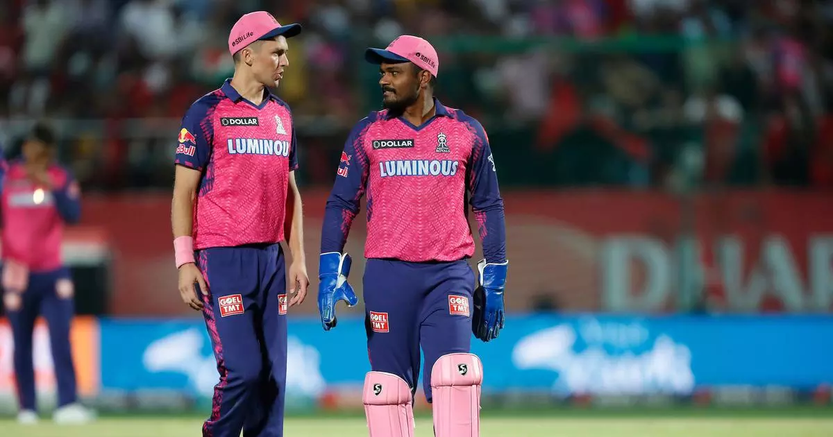സഞ്ജു സാംസണും ട്രെന്റ് ബൌള്ട്ടും പഞ്ചാബിനെതാരിയ മത്സരത്തിനിടെ