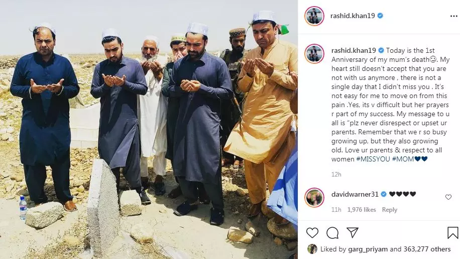 ''മാതാപിതാക്കളെ ഒരിക്കലും അനാദരിക്കുകയോ വിഷമിപ്പിക്കുകയോ ചെയ്യരുത്. നമ്മൾ വളരുന്നതിനനുസരിച്ച് അവർക്കും പ്രായമാകുന്നുണ്ടെന്ന കാര്യം ഓർക്കുക'' മാതാവിന്റെ ഒന്നാം ചരമവാർഷികത്തിൽ അഫ്ഗാനിസ്താൻ ക്രിക്കറ്റ് താരം റാഷിദ് ഖാന് ലോകത്തിനു നൽകാനുള്ള സന്ദേശമാണിത്.