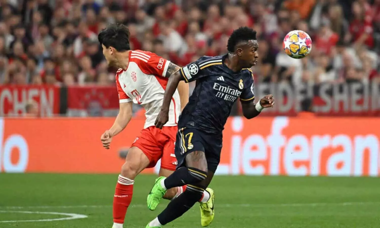 അലൈൻസ് അരീനയിൽ കളത്തിലും കണക്കിലും ഇരുടീമുകളും ബലാബലം നിന്നപ്പോൾ ആരാധകർക്കത് ആവേശക്കാഴ്ചയായി. മത്സരത്തിന്റെ 24ാം മിനിറ്റിൽ റയലാണ് ഗോൾവേട്ടക്ക് തുടക്കം കുറിച്ചത്. ടോണി ക്രൂസ് ബ്രില്ല്യൻസിൽ വിനീഷ്യസിന്റെ ക്ലിനിക്കൽ ഫിനിഷ്. മൈതാന മധ്യത്ത് നിന്ന് പന്ത് പിടിച്ചെടുത്ത് ബയേൺ പ്രതിരോധ താരങ്ങളെ മുഴുവൻ കബളിപ്പിച്ച് ക്രൂസ് അളന്നു മുറിച്ച് നൽകിയ പാസിനെ മനോഹരമായൊരു ഫിനിഷിൽ വിനീഷ്യസ് വലയിലാക്കി.