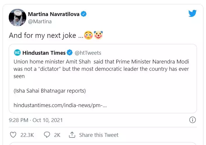 'എന്റെ അടുത്ത തമാശ...' മോദി ഏകാധിപതിയല്ലെന്ന അമിത് ഷായുടെ പ്രസ്താവനയെ പരിഹസിച്ച് മാർട്ടിന നവ്രതിലോവ