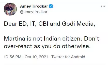 ഞായറാഴ്ച ഇന്ത്യൻ സമയം രാത്രി ഒമ്പതരയോടെയാണ് അമിത് ഷായുടെ പ്രസ്താവന ഉൾക്കൊള്ളുന്ന ഹിന്ദുസ്ഥാൻ ടൈംസ് റിപ്പോർട്ട് മാർട്ടിന ട്വിറ്ററിൽ പങ്കുവെച്ചത്. 'ഇനി എന്റെ അടുത്ത തമാശയ്ക്കുള്ളത്...' എന്നായിരുന്നു അവരുടെ വാക്കുകൾ. മിനുട്ടുകൾക്കുള്ളിൽ ഇത് ട്വിറ്ററിൽ തരംഗമാവുകയും ചെയ്തു.