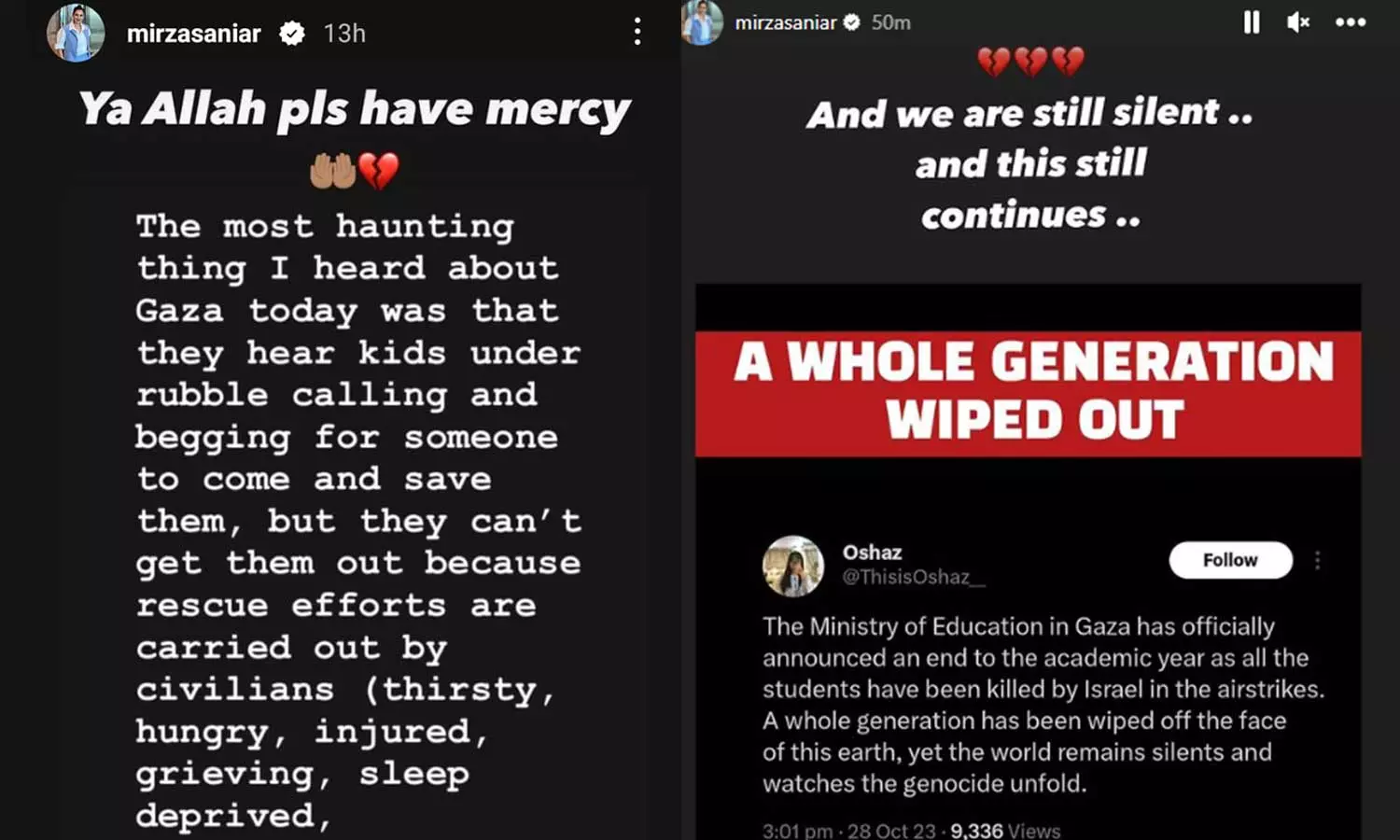 ഗസ്സയിലെ കെട്ടിടാവശിഷ്ടങ്ങൾക്കിടയിൽ രക്ഷിക്കണമെന്ന് യാചിച്ചു നിലവിളിക്കുന്ന കുട്ടികളുടെ ശബ്ദം കേൾക്കാമെന്ന് മറ്റൊരു സ്റ്റോറിയിൽ പറയുന്നു. വിശന്നുവലഞ്ഞവരും പരിക്കേറ്റവരും ഉറക്കം നഷ്ടപ്പെട്ടവരും മാനസികസംഘർഷം നേരിടുന്നവരും ഉൾപ്പെടെയുള്ള സിവിലിയന്മാരാണു രക്ഷാപ്രവർത്തനം നടത്തുന്നതിനാൽ അവരെയൈാന്നും രക്ഷിക്കാനായിട്ടില്ലെന്നും കുറിപ്പിൽ ചൂണ്ടിക്കാട്ടുന്നു. 'അല്ലാഹുവേ, കരുണ കാണിക്കണം' എന്ന് ഈ പോസ്റ്റ് പങ്കുവച്ച് സാനിയ കുറിച്ചു.