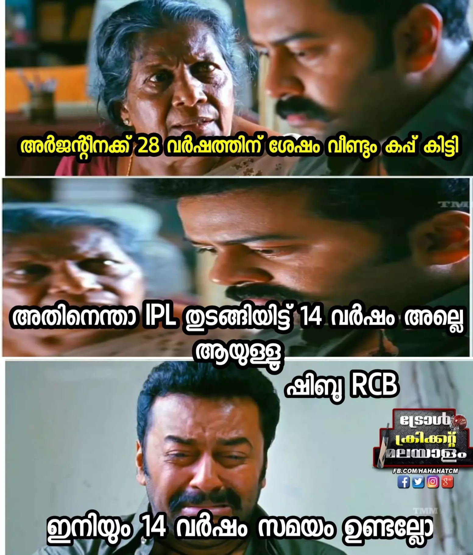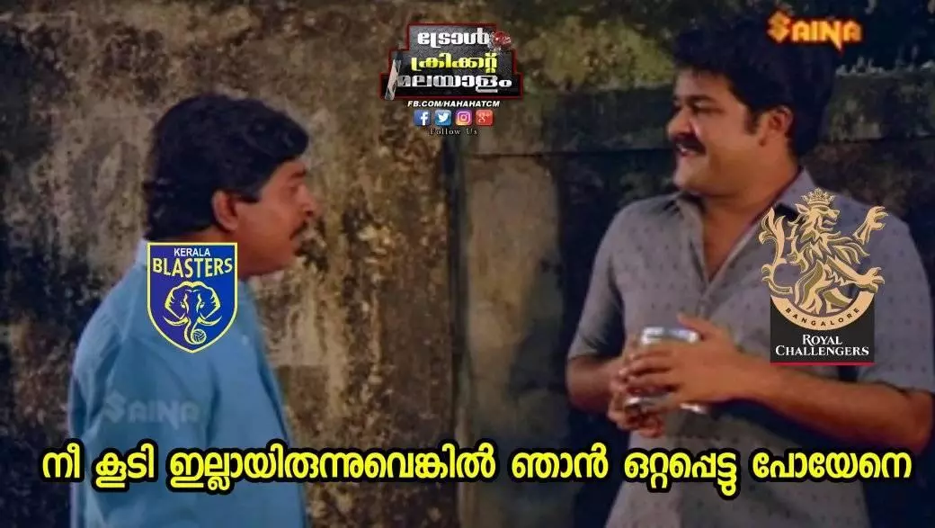 ഐപിഎല് ആരംഭിച്ച് 14 വര്ഷങ്ങളായെങ്കിലും പലതവണ ഫൈനലിലെത്തിയെങ്കിലും ഐപിഎല് കിരീടം കോലിക്കും കൂട്ടര്ക്കും ഇന്നും കിട്ടാക്കനിയാണ്. ഇന്നലെ വരെ അക്കൂട്ടത്തില് അര്ജന്റീനയുണ്ടായിരുന്നു. ഇന്നുരാവിലെ മുതല് ആര്. സി. ബി മാത്രമാണ് ബാക്കി. അതേസമയം ആര്.സി.ബിക്ക് കൂട്ടായി ഐ.എസ്.എല്ലിലെ കേരള ടീമായ ബ്ലാസ്റ്റേര്സുമുണ്ടെന്ന രീതിയിലുള്ള ട്രോളുകളും പരക്കുന്നുണ്ട്.