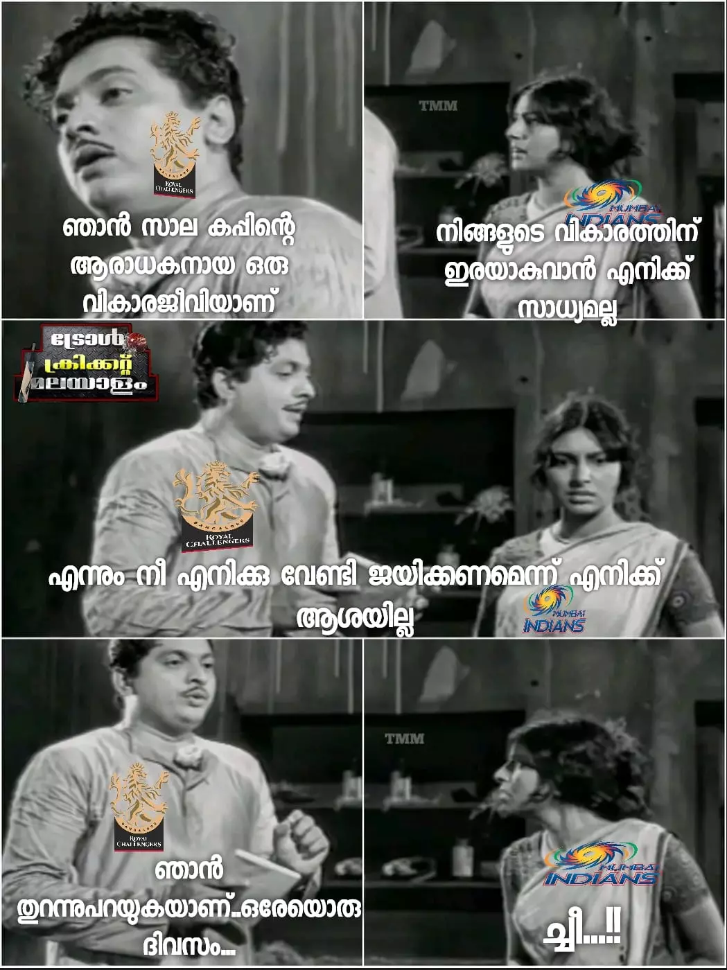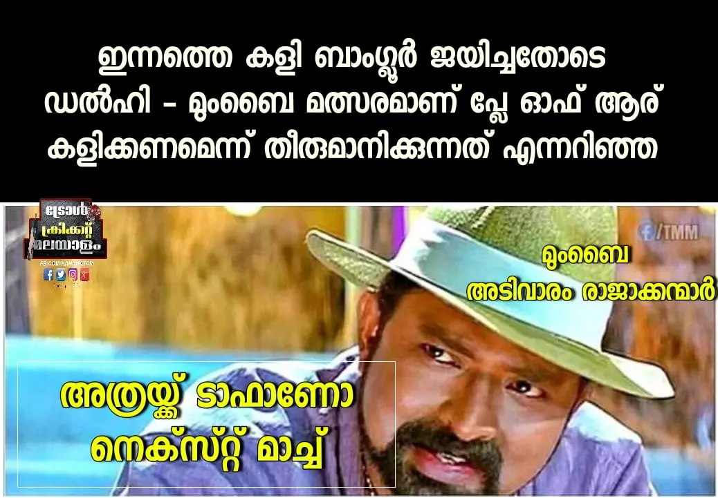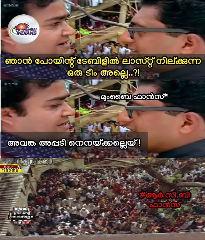 ട്രോൾ ഗ്രൂപ്പുകളിലും ബാംഗ്ലൂർ ആരാധകർ മുംബൈയെ പിന്തുണച്ച് രംഗത്തെത്തിയിട്ടുണ്ട്. ചില ട്രോളുകൾ ഇവയാണ്.
