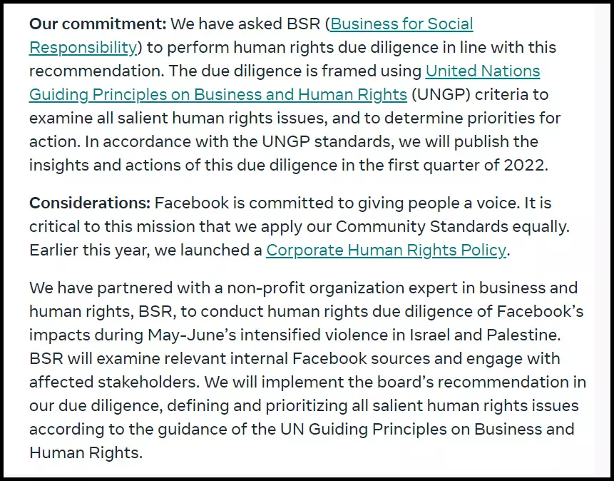 'ബിസിനസ്, മനുഷ്യാവകാശം എന്നീ മേഖലകളിൽ വിദഗ്ധരായ ബി.എസ്.ആറുമായി (ബിസിനസ് ഫോർ സോഷ്യൽ റെസ്പോൺസിബിലിറ്റി) ഞങ്ങൾ കൈകോർക്കുകയാണ്. കഴിഞ്ഞ മെയ്, ജൂൺ മാസങ്ങളിലായി ഫലസ്തീനിലും ഇസ്രയേലിലും നടന്ന അക്രമങ്ങളിൽ ഫേബ്സുക്കിന്റെ സ്വാധീനം സംബന്ധിച്ചുള്ള അന്വേഷണം നടത്തുന്നതിനു വേണ്ടിയാണിത്. ബി.എസ്.ആർ ഫേസ്ബുക്കിനുള്ളിലെ വ്യക്തികളുമായും ബാധിക്കപ്പെട്ട വ്യക്തികളുമായും സംസാരിക്കും. ബിസിനസ്, മനുഷ്യാവകാശ മേഖലകളിൽ യു.എൻ നയങ്ങൾക്കനുസൃതമായി നയം പരിഷ്കരിക്കുന്നതിൽ അവരുടെ ശിപാർശകളെ ഞങ്ങൾ ആശ്രയിക്കും.' - ഫേസ്ബുക്ക് പ്രസ്താവനയിൽ പറഞ്ഞു. അന്വേഷണത്തിലെ കണ്ടെത്തൽ അടുത്ത വർഷം പുറത്തുവിടുമെന്നും കമ്പനി വ്യക്തമാക്കി.