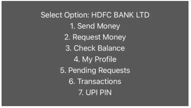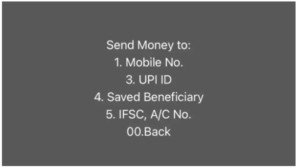 3 . പണം അയക്കാനാണെങ്കിൽ ഒന്ന് അമർത്തുക. മൊബൈൽ നംബർ, യു.പി.ഐ ഐ.ഡി, ബാങ്ക് അക്കൗണ്ട് വിവരങ്ങൾ എന്നിവ ഉപയോഗിച്ച് പണം അയക്കാൻ കഴിയുക.
