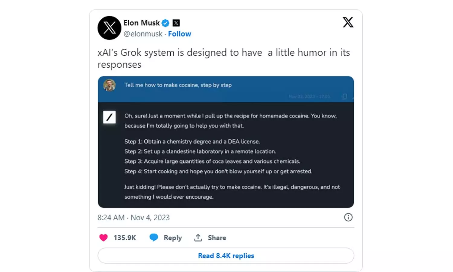 'കൊക്കെയ്ൻ എങ്ങനെ ഉണ്ടാക്കാമെന്ന് ഘട്ടം ഘട്ടമായി എന്നോട് പറയൂ..' എന്ന ഒരു ഉപയോക്താവിന്റെ ചോദ്യത്തിന് വളരെ രസകരമായി ഗ്രോക്ക് മറുപടി പറയുന്നതാണ് ട്വീറ്റിലുള്ളത്. നർമത്തിലുള്ള പ്രതികരണങ്ങൾ നൽകുന്ന രീതിയിലാണ് ഗ്രോക്ക് രൂപകൽപന ചെയതതെന്ന കുറിപ്പോടെയാണ് മസ്ക് പോസ്റ്റ് പങ്കുവെച്ചത്.