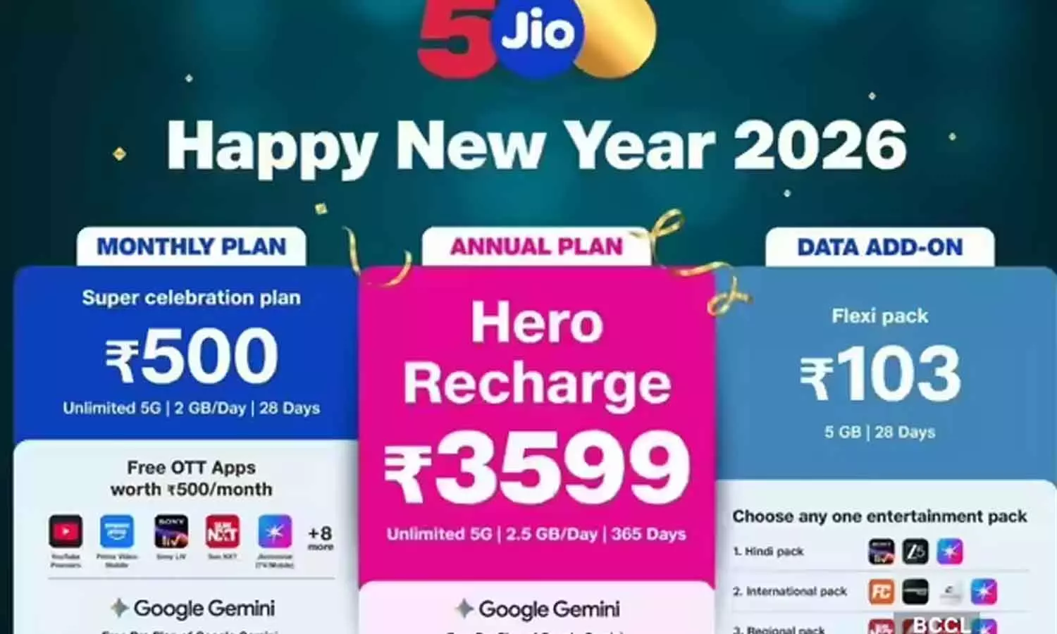 മൂന്ന് പുതിയ പ്രീപെയ്ഡ് പ്ലാനുകളാണ് അവതരിപ്പിച്ചത്. റിലയന്സ് ജിയോ ഹാപ്പി ന്യൂ ഇയര് 2026 എന്ന് പേരിട്ടിരിക്കുന്ന ഈ പ്രീപെയ്ഡ് പ്ലാനുകള് എല്ലാ തരം ഉപയോക്താക്കളെയും ലക്ഷ്യമിട്ടു കൊണ്ടാണ് പുറത്തിറക്കിയിരിക്കുന്നത്.