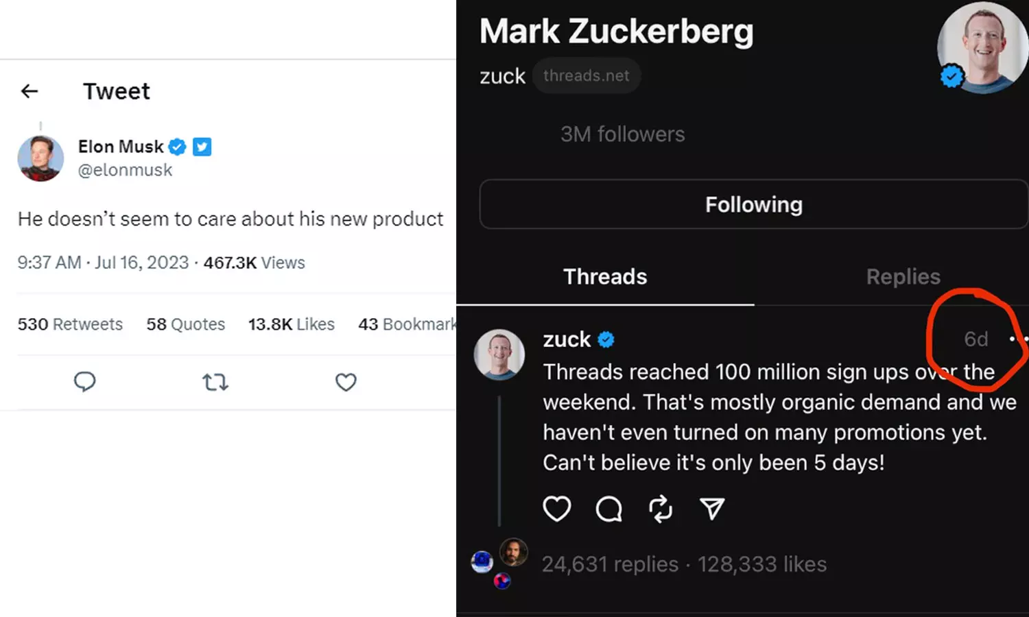 ഇലോൺ മസ്കും സക്കർബർഗിനെ വിമർശിച്ച് പോസ്റ്റുമായി രംഗത്തെത്തിയിട്ടുണ്ട്. 'മെറ്റാ' സി.ഇ.ഒ മാർക്ക് സക്കർബർഗ് ആറ് ദിവസമായി ത്രെഡ്സിൽ ഒരു പോസ്റ്റും പങ്കുവെച്ചിട്ടില്ലെന്ന് ഒരു ട്വീറ്റ് ചൂണ്ടിക്കാണിച്ചതിന് പിന്നാലെയാണ് മസ്ക് ട്വീറ്റുമായി എത്തിയത്. 'അദ്ദേഹം (സക്കർബർഗ്) തന്റെ പുതിയ പ്രൊഡക്ടിനെ ശ്രദ്ധിക്കുന്നില്ല എന്നാണ് തോന്നുന്നത്' എന്നായിരുന്നു മസികിന്റെ ട്വീറ്റ്.