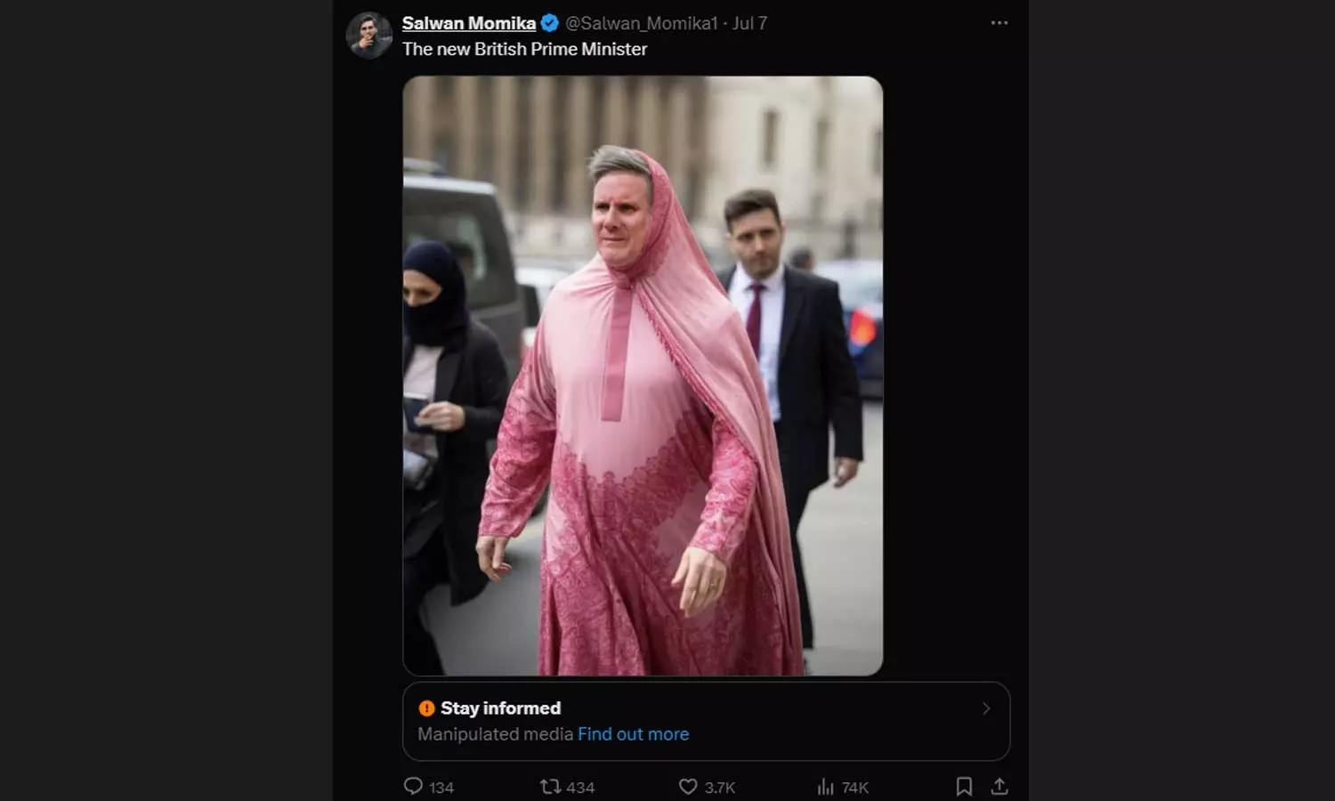 ഇതിനിടെ, സ്റ്റാര്മറിനെ കുറിച്ചുള്ള പലതരത്തിലുള്ള പ്രചാരണങ്ങളും സോഷ്യല് മീഡിയയില് നടക്കുന്നുണ്ട്. ഇതിലൊന്നാണ് പിങ്ക് പര്ദയില് തലയും മറച്ച് റോഡിലൂടെ നടക്കുന്ന അദ്ദേഹത്തിന്റെ ചിത്രം. സ്വീഡനില് ഖുര്ആന് പരസ്യമായി കത്തിച്ചു വാര്ത്തകളില് നിറഞ്ഞ സാല്വാന് മോമികയാണ് ഈ ചിത്രം എക്സില് പങ്കുവച്ചത്. പുതിയ ബ്രിട്ടീഷ് പ്രധാനമന്ത്രി എന്ന അടിക്കുറിപ്പോടെയാണ് പോസ്റ്റ്.