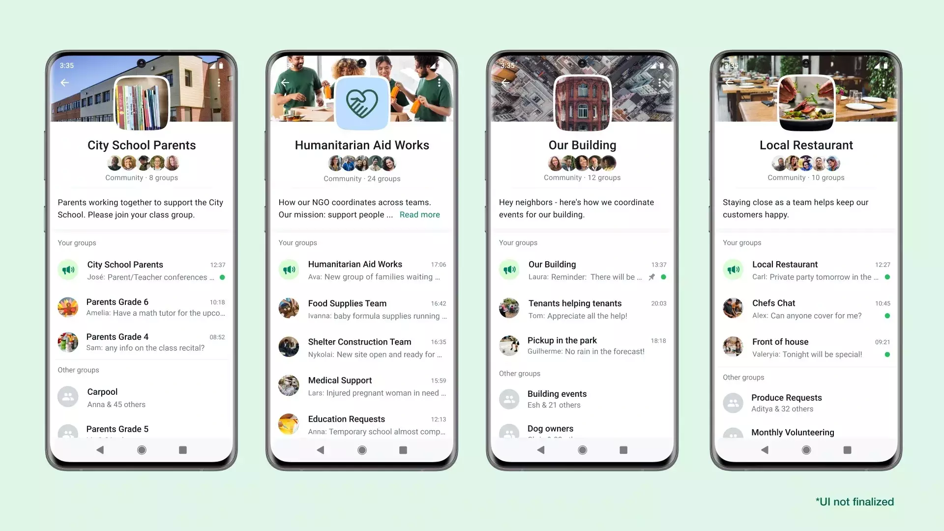 കമ്മ്യൂണിറ്റികൾ: പൊതുവായ താൽപ്പര്യമുള്ള ഗ്രൂപ്പുകളെ ഒരുമിച്ചു ഒരൊറ്റ പോയിന്റില് ലഭ്യമാക്കുന്ന പുതിയ ഫീച്ചറാണിതെന്നാണ് വാട്ട്സ് ആപ്പ് അറിയിക്കുന്നത്. ഒരൊറ്റ കേന്ദ്രത്തിന് കീഴില് വരുന്ന ഗ്രൂപ്പുകളെയെല്ലാം ഒന്നിച്ചുചേര്ത്ത് വാട്ട്സ് ആപ്പിന്റെ മറ്റെല്ലാ ഫീച്ചറുകളും എളുപ്പത്തില് ലഭ്യമാക്കുന്നതാണ് ഈ പുതിയ സംവിധാനം. ഇതിന്റെ ഇന്റര്ഫേസ് ഇതുവരെ അന്തിമമായിട്ടില്ലെന്ന് വാട്ട്സ് ആപ്പ് അറിയിച്ചു.