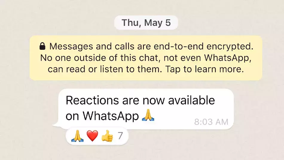ഫേസ്ബുക്ക് സി.ഇ.ഒ മാര്ക്ക് സക്കര്ബര്ഗ് ഇക്കാര്യം നേരത്തെ പ്രഖ്യാപിച്ചിരുന്നു. ആറ് ഇമോജി റിയാക്ഷനുകളാണ് വാട്സ്ആപ്പ് അവതരിപ്പിച്ചിരിക്കുന്നത്. ലൈക്ക്, ലവ്, സര്പ്രൈസ്, ചിരി, സങ്കടം, നന്ദി എന്നിവയാണവ. ഇത് മാറ്റാന് സാധിക്കില്ല. പതിയെ കൂടുതല് ഇമോജികള് ലഭ്യമാക്കും.