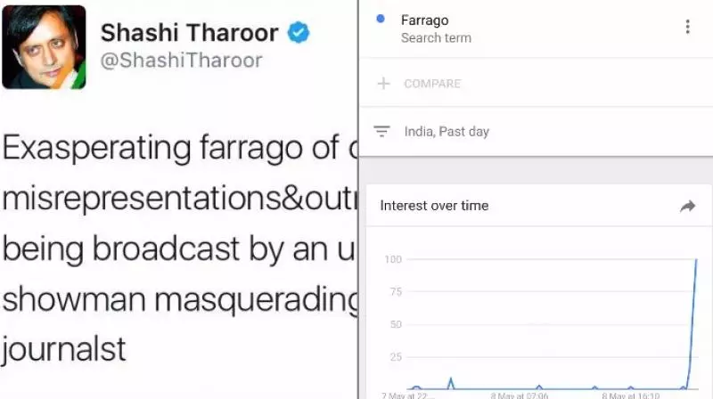 തന്റെ ട്വീറ്റില് തരൂര് ഉപയോഗിച്ച ഫറാഗോ (Farrago) എന്ന വാക്കിന്റെ അര്ഥം തേടി ഗൂഗിളിനെ സമീപിച്ചവര് അനവധിയാണ്. എന്നാല് ഫെറാഗോ പ്രയോഗം ഗൂഗിളിനെ മാത്രമല്ല ഓക്സ്ഫോര്ഡ് ഡിക്ഷണറിയെയും ഞെട്ടിച്ചിരിക്കുകയാണ്. വാക്കിന്റെ അര്ഥം തേടി ഓക്സ്ഫേര്ഡിന്റെ ഓണ്ലൈന് ഡിക്ഷണറിയെ സമീപച്ചവരുടെ എണ്ണം അത്ഭുതപ്പെടുത്തിയെന്നാണ് അധികൃതരുട വെളിപ്പെടുത്തല്. ഓക്സ്ഫോര്ഡ് ഡിക്ഷണറിയുടെ ഔദ്യോഗിക ട്വീറ്റര് ഹാന്ഡിലില് തന്നെയാണ് ഈ ഞെട്ടല് പങ്കുവച്ചിട്ടുള്ളത്.