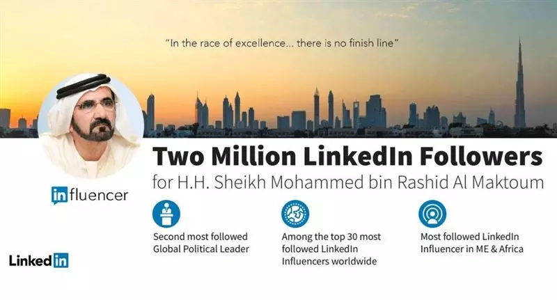 ലോകത്തെ ഏറ്റവും വലിയ പ്രഫഷനൽ നെറ്റ് വർക്കിങ് പ്ലാറ്റ്ഫോമായ ലിങ്ക്ഡ്ഇനിൽ യു.എ.ഇ വൈസ് പ്രസിഡൻറും പ്രധാനമന്ത്രിയും ദുബൈ ഭരണാധികാരിയുമായ ശൈഖ് മുഹമ്മദ് ബിൻ റാശിദ് ആൽ മക്തൂമിന്റെ ഫോളോവേഴ്സ് 20 ലക്ഷത്തിലെത്തി. ലോകത്ത് ഏറ്റവും കൂടുതൽ ലിങ്ക്ഡ്ഇൻ ഫോളോവർമാരുള്ള 30 പേരിൽ ഒരാളായ ശൈഖ് മുഹമ്മദ് രാഷ്ട്ര നേതാക്കളിൽ ഏറ്റവും കൂടുതൽ ഫോളോവർമാരുള്ള രണ്ടാമത്തെ വ്യക്തിയാണ്.