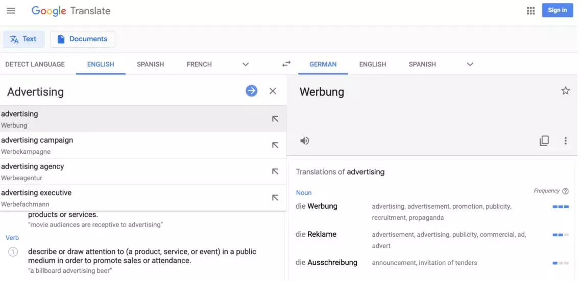 ഡോക്യുമെന്റ് ഫയലുകള് അപ്ലോഡ് ചെയ്ത് തര്ജമ ചെയ്യാനും പ്രത്യേകം വാക്കുകള് നല്കി തര്ജമ ചെയ്യാനുമുള്ള ഓപ്ഷനുകള് ഇടത് ഭാഗത്ത് മുകളിലായി നല്കിയിട്ടുണ്ട്. ഇന്പുട്ട് വിന്ഡോയില് ഒരു വാക്ക് നല്കുമ്പോള്, അതിന്റെ അര്ത്ഥം, പര്യായങ്ങള്, പദപ്രയോഗം, ക്രിയാവിശേഷണം ഉള്പ്പടെയുള്ള നിര്വചനങ്ങള് താഴെ കാണാം. പര്യായപദങ്ങൾ ക്ലിക്ക് ചെയ്താല് അതിന്റെ തര്ജമയും കാണാം.