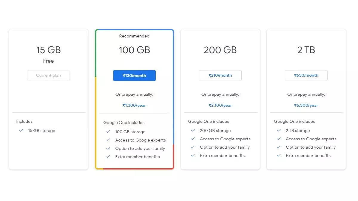 2021 ജൂണ് 1 ന് മുമ്പ് നിങ്ങള് അപ്ലോഡ് ചെയ്യുന്ന ഏതെങ്കിലും ഫോട്ടോകളും ഡോക്യുമെന്റുകളും 15 ജിബി ക്യാപ്പിനെതിരെ കണക്കാക്കില്ല. ഈ തീയതിക്ക് ശേഷം അപ്ലോഡ് ചെയ്ത ഫയലുകള്ക്കൊപ്പം ക്യാപ് പ്രാബല്യത്തില് വരും. ഇതിന് തന്നെ മൂന്ന് പാക്കേജുകളുണ്ട്. ആദ്യത്തെ പാക്കേജില് പ്രതിമാസം 130 രൂപ കൊടുത്ത് 100 ജിബി സ്പേസ് ലഭ്യമാകും. ഒരു വർഷത്തേക്കാണെങ്കിൽ 1300 രൂപക്കും ലഭ്യമാണ്. 210 രൂപയുടെ പ്ലാനിൽ 200 ജി.ബി ഡേറ്റയാണ് ബാക്കപ്പിൽ ഉപയോഗിക്കാവുന്നത്. പ്രതിമാസം 650 രൂപക്കുള്ളതാണ് അടുത്ത പ്ലാൻ. കിട്ടുന്ന സ്പേസ് 2TBയാണ് ഒരു വർഷത്തേക്കാണെങ്കിൽ നിങ്ങൾക്ക് 6500 രൂപക്കും ഇത് ലഭ്യമാകും ഇത് ആൻഡ്രോയിഡ് യൂസർമാർക്കുള്ളതാണ്. ആപ്പിൾ യൂസർമാർക്കും പ്ലാനുകൾ ഇതു പോലെ തന്നെ. 195 രൂപയുടേതാണ് പ്ലാൻ തുടങ്ങുന്നത്. ഇന്ത്യൻ യൂസർമാരെ സംബന്ധിച്ചിടത്തോളം 100 ജി.ബി താരതമ്യേനെ ഭേദപ്പെട്ടതാണ്.